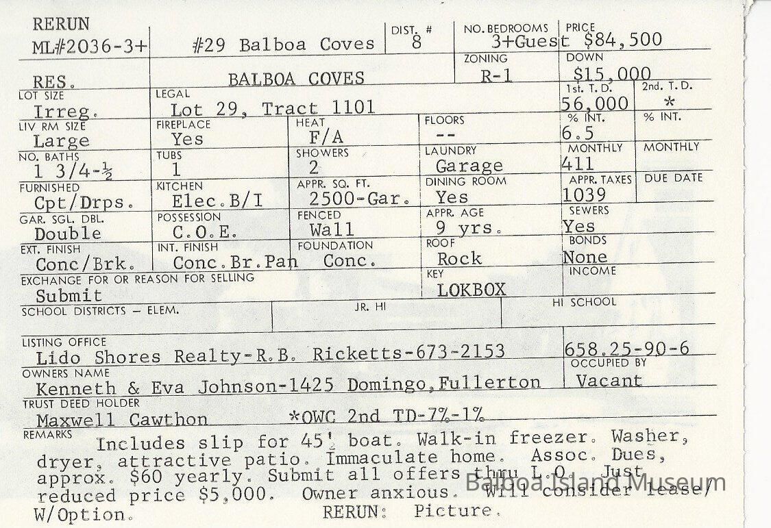 29 Balboa Coves info card. White notecard with info on the front, picture of the house on the back.Collection