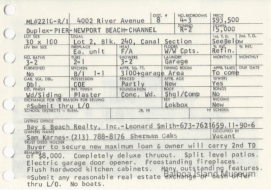 4002 River Avenue info card. White notecard with info on the front, picture of the house on the back.Collection