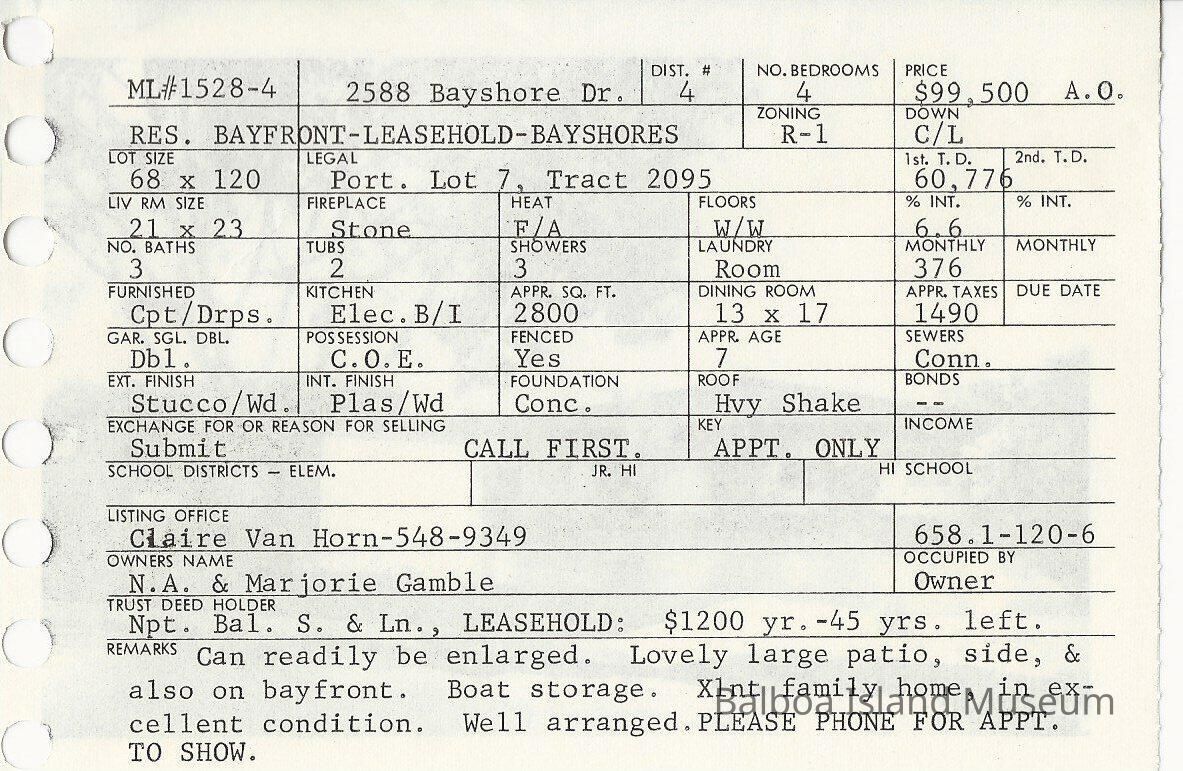 2588 Bayshore Drive info card. White notecard with info on the front, picture of the house on the back.Collection