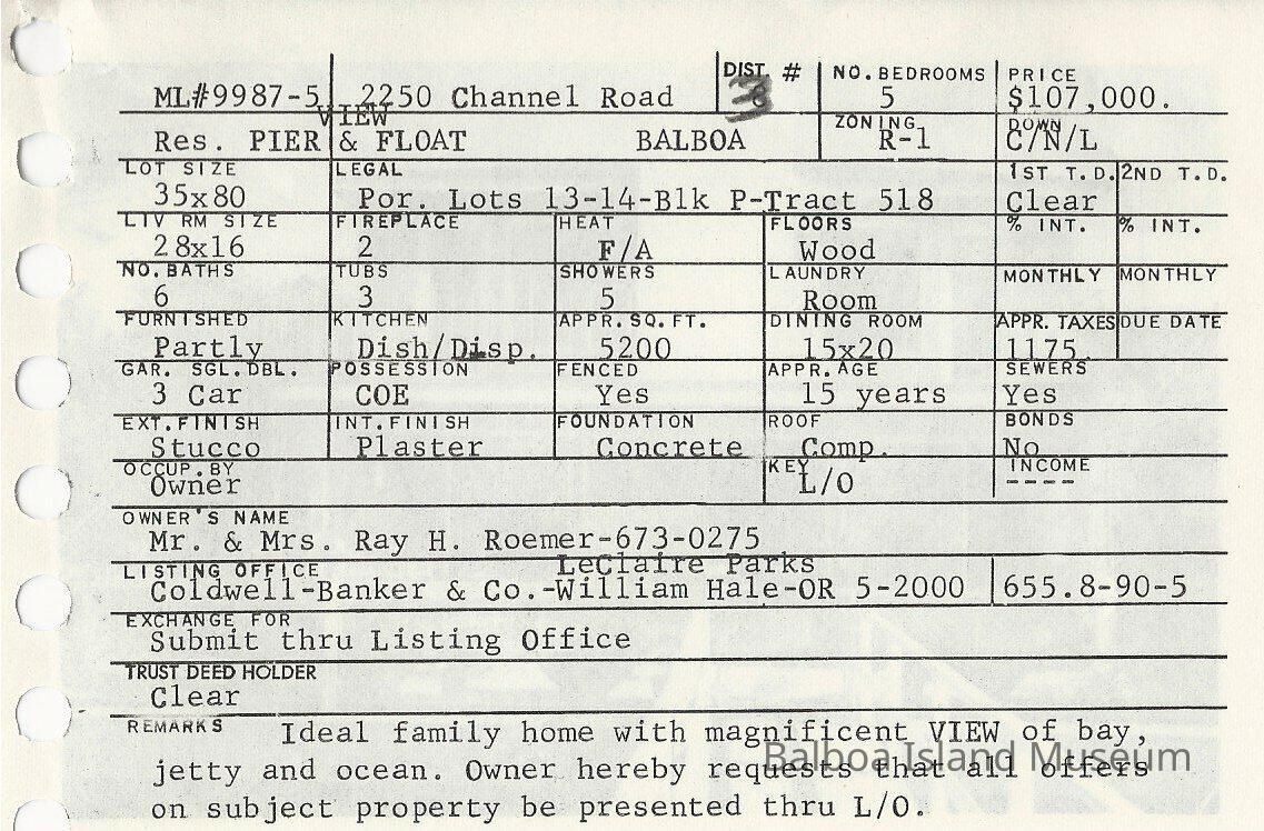 2250 Channel Road info card. White notecard with info on the front, picture of the house on the back.Collection