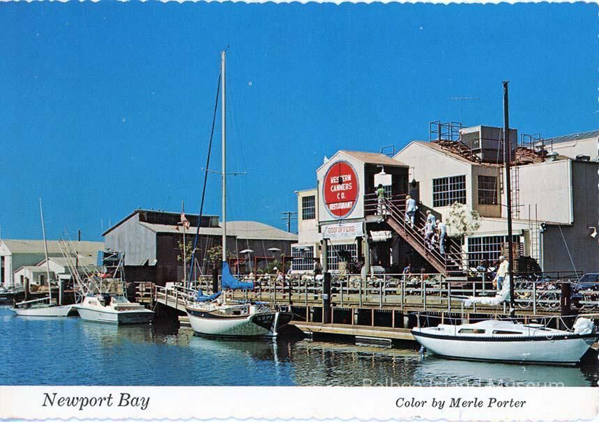 A color photograph of hte Cannery after it was turned into the Western Canners Co. Restaurant. There are a few yachts docked in front and some people walking up the stairs outside of the building. White banner along the bottom with the title and "Color by Merle Porter". Scalloped edges.