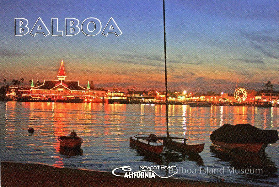 A color photograph of the Balboa Pavilion (decorated for christmas) and fun zone taken from the beach on Balboa Island somewherein the 500 block. There is a catamaran and two boats moored to the beach. "Newport Beach California" is written in the middle of the bottom edge in white and "Balboa" is printed in the upper left corner in translucent bubble letters.