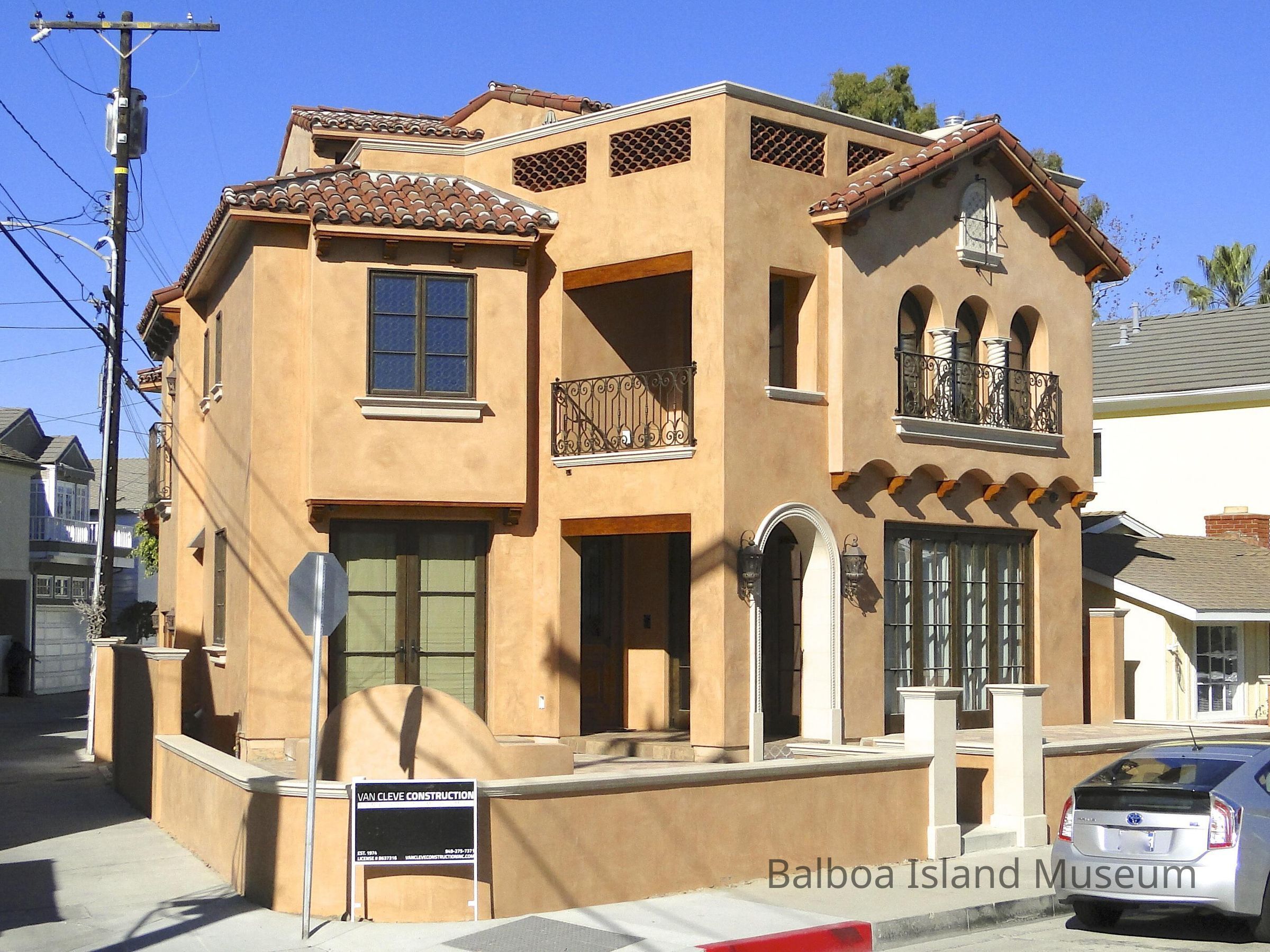 Color photo in front of home at 111 Emerald Avenue. The Spanish style house has two or three stories with a roof-top deck and covered in burnt orange stucco with a terra cotta roof. The roof-top deck has a stucco and tile railing with the tiles acting as filler for the openings in the stucco as opposed to iron. The other decks have ironwork railings. The front archway is painted white. There is a covered patio on the second story at the front of the house.
