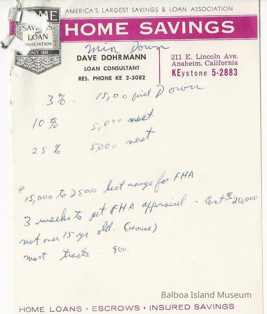 White piece of note paper with a magenta header that says "Home Savings" on it. Blue-pen notes written on it.Collection