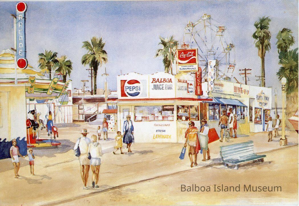 Two copies of a postcard with a print of the Balboa fun Zone o the front. There are shop fronts on the right and the Ferris Wheel behind that. The carousel is on the left with the Arcade sign. Painted from the beach. The shops include a Juice Bar, a burger stand, and "The Balboa Beach Company".Subject