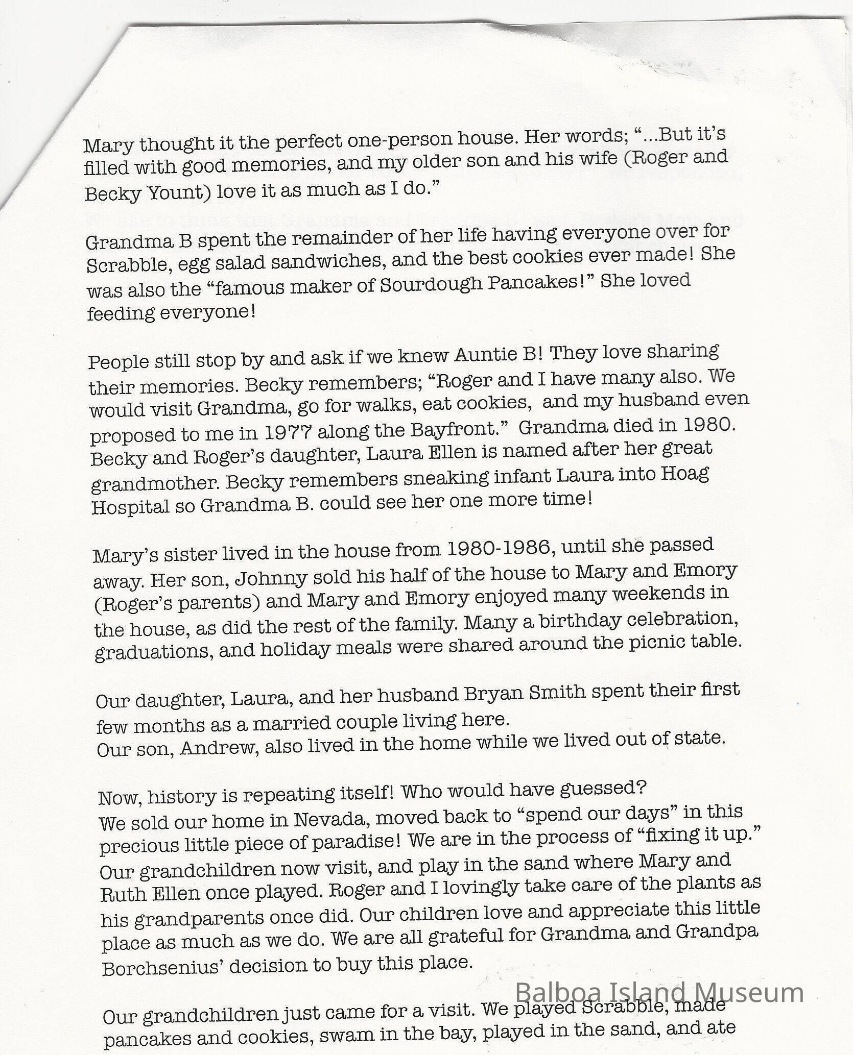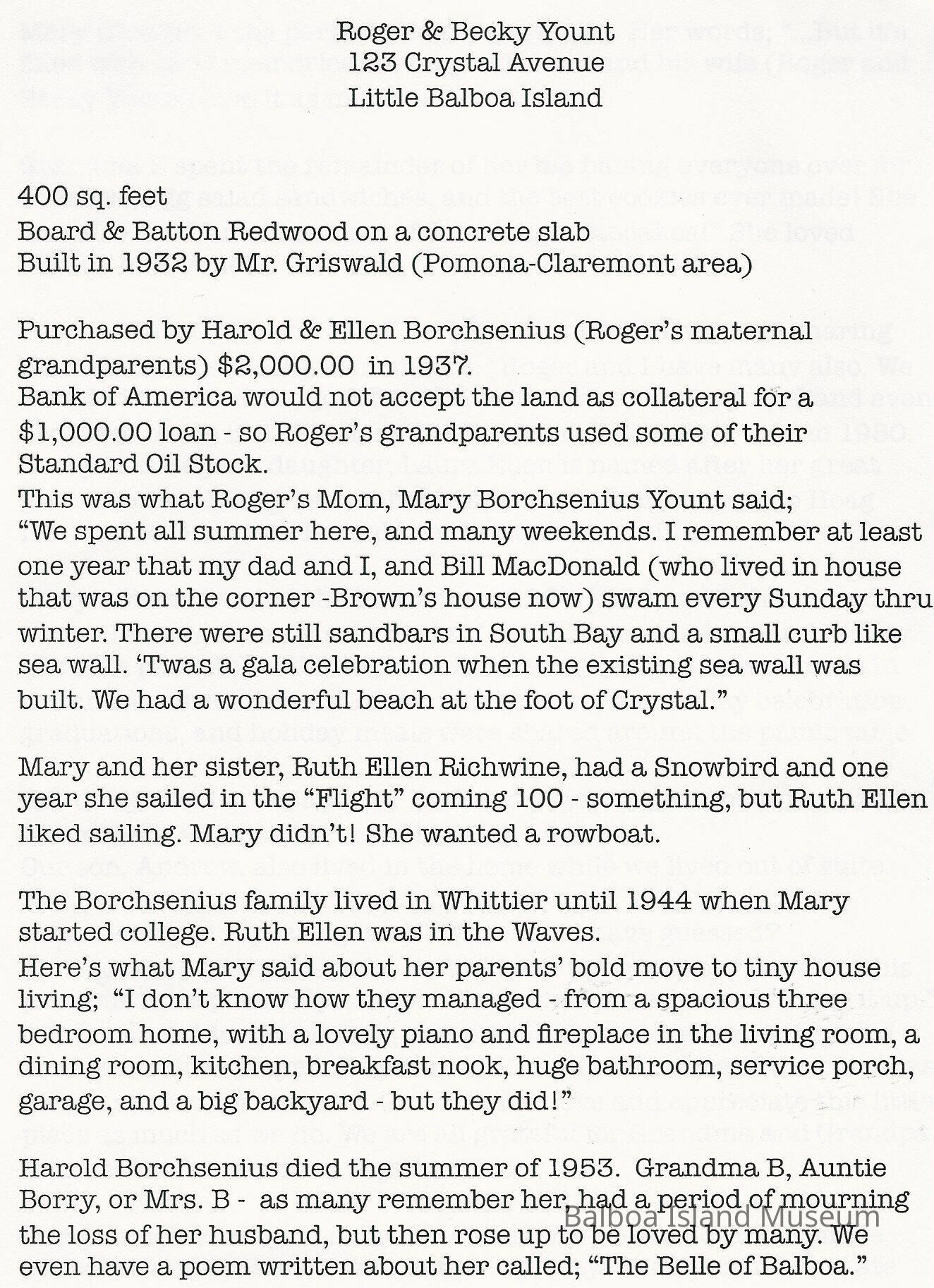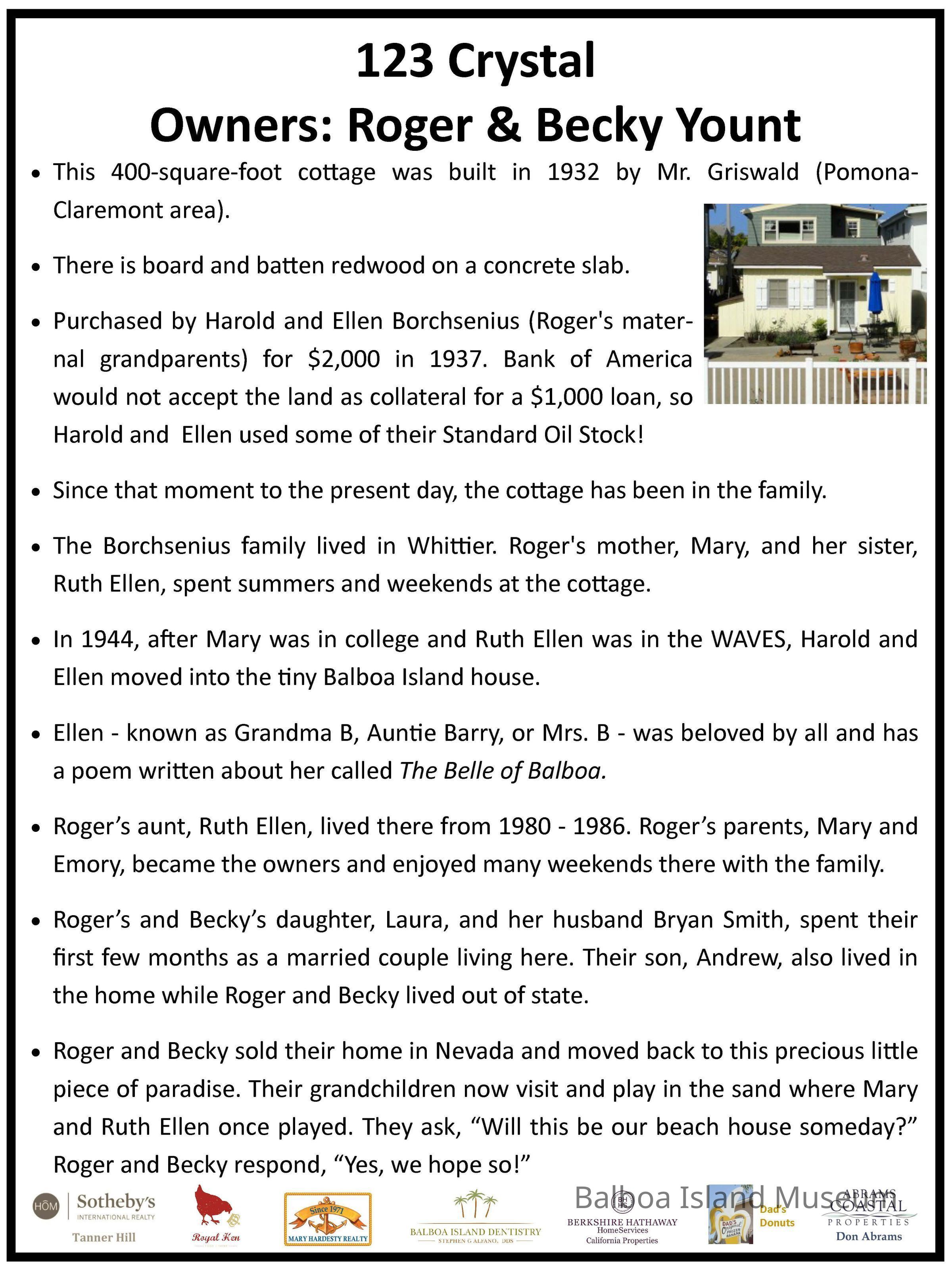 123 Crystal Avenue white info chart, black text, contains historic info on the house.Collection