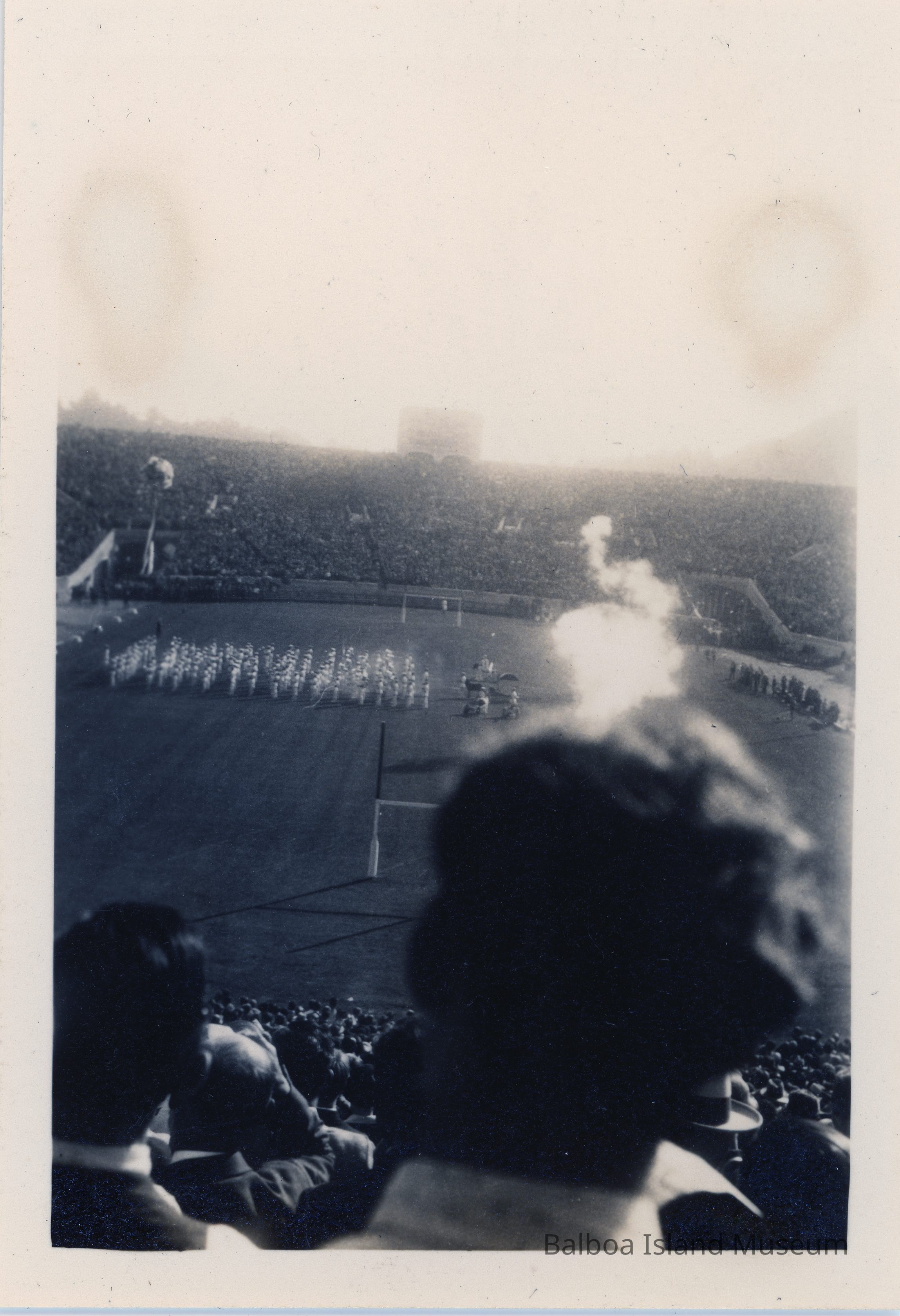 Photograph at a football game with what appears to be a marching band on the fieldPhotograph Details