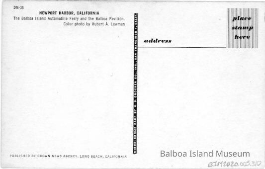 two copies of a color photograph postcard of the docks beside the Balboa Ferry landing taken from an elevated position looking towards the Pavilion. The docks have several power boats docked there and two sailboats with their sails unfurled. There is a ferry pulling away from the dock on the left side.
