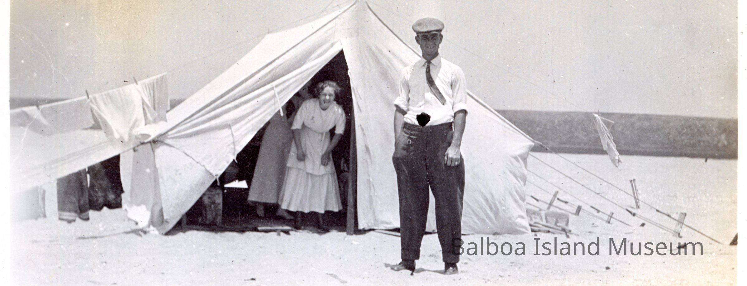 A photograph of a man standing outside the tent on Balboa Island while a woman is inside the tent ducking down and looking at the photographer. There are swimsuits and sheets or blankets hanging on one of the tent's lines to the left. Taken around July 4, 1911. Adhered to black album page 2.