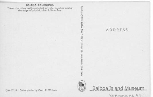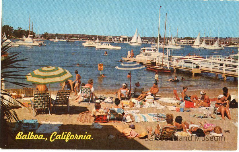 A color postcard of beach goers on the sand beside a pier on the Peninsula side. The photograph is looking across the water towards the hills. The cluster of trees to the left might be on either Harbor or Lido Island. It is difficult to say for certain where the photograph was taken as there are not enough landmarks to make that identification. "Balboa, California" written in yellow cursive script in the bottom left corner.Subject