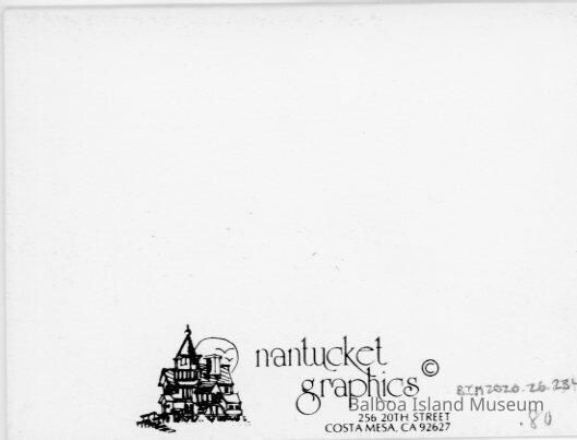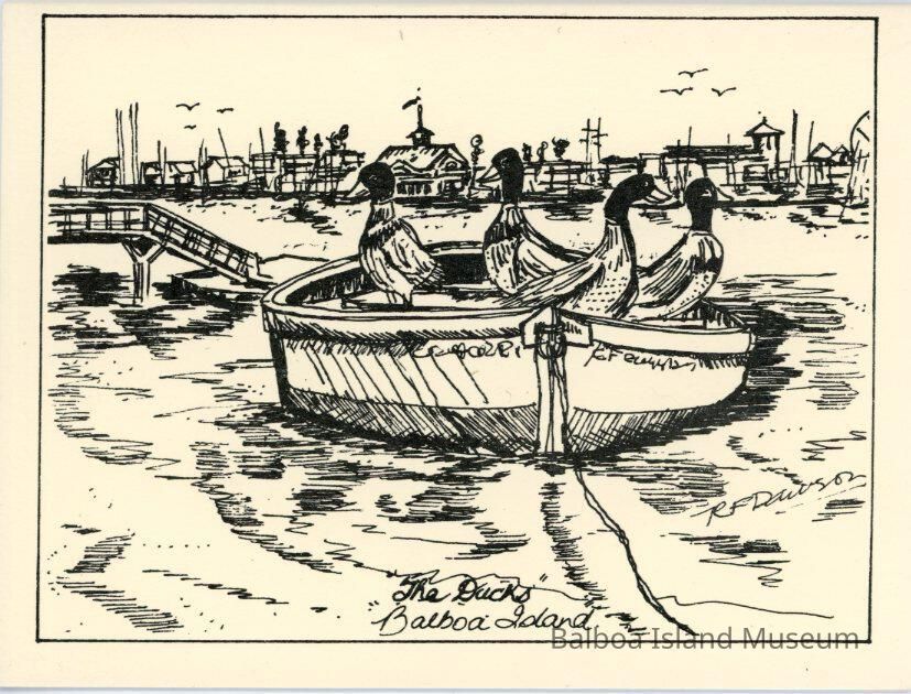 A notecard with a line drawing on the front of four ducks inside a dingy on the shore along South Bay front. The edge of a Ferris wheel is visible on the right side and the balboa Pavilion is in the middle in the background. Pained by R. F. Dawson. Published by Nantucket Graphics.Collection