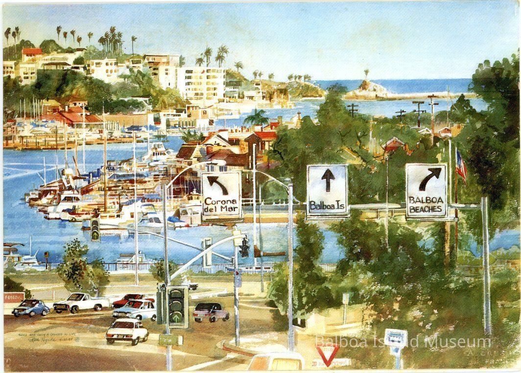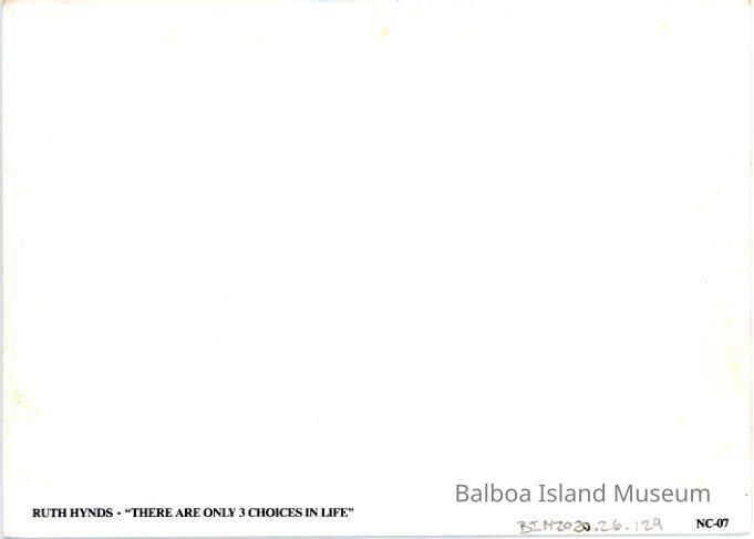 A large notecard featuring a painting by Ruth Hynds called "Only 3 Choices in Life". It is pained from the top of Jamboree looking down onto the harbor and the intersection for Balboa Island. There are three arrows off a street sign that reads "Corona del Mar" to the left, "Balboa Is." straight, and "Balboa Beaches" to the right. Balboa island sits behind it and Corona del Mar with the Balboa Yacht club and the harbor entrance area along the background. No publisher information. Number NC-07.Collection