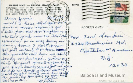 Message on the back. Sent January 12, 1970 to Mrs. Fred Lemba in Castle-on-Hudson, New York from Myrtle. Postcard was published by Mitock & Sons and printed by Colourpictures in Boston. Postcard number P29763. There is a blurb on the back about Marine Avenue.Subject