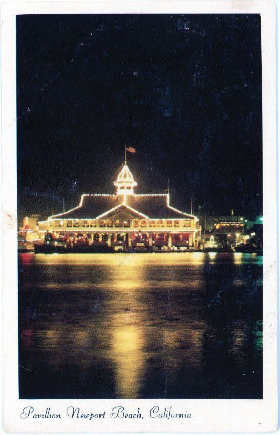 A color photograph of the Balboa Pavilion lit up with a white border. The photograph was taken from the water or Balboa Island off a dock. The title on the bottom is written in a black cursive-style script.