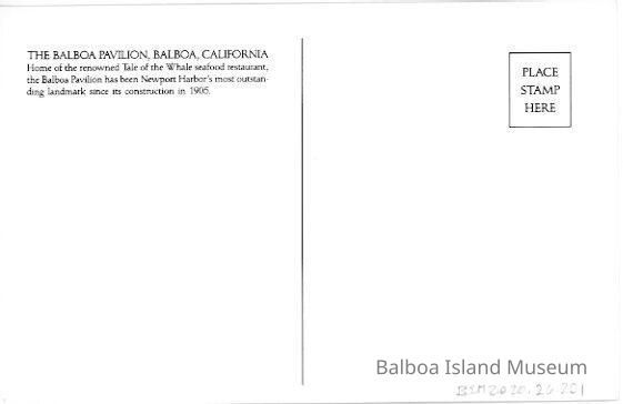 A thin color photograph postcard of the Balboa Pavilion lit up with lights at dusk. The sky is mostly dark. No printer or publisher information. There is a shore paragraph on the back about the Balboa Pavilion. It may have been put out by Tale of the Whale, as the restaurant is specifically mentioned on the back.Subject