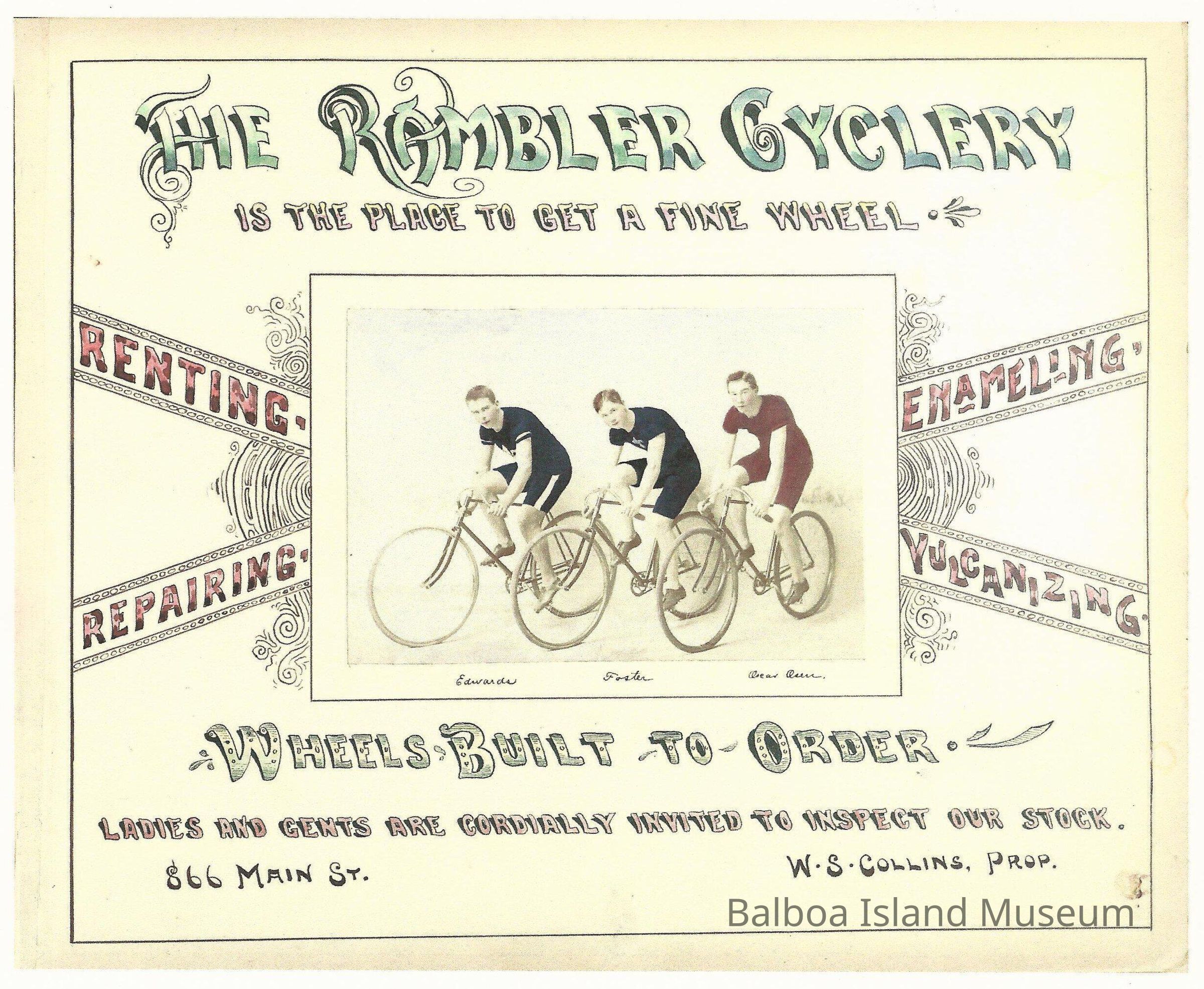 Collins was proprietor of The Rambler Cyclery, a bicycle shop and a member of the Riverside Wheelman, a large bicycle club. During this time period the principal form of transportation was by bicycle or horseLexicon