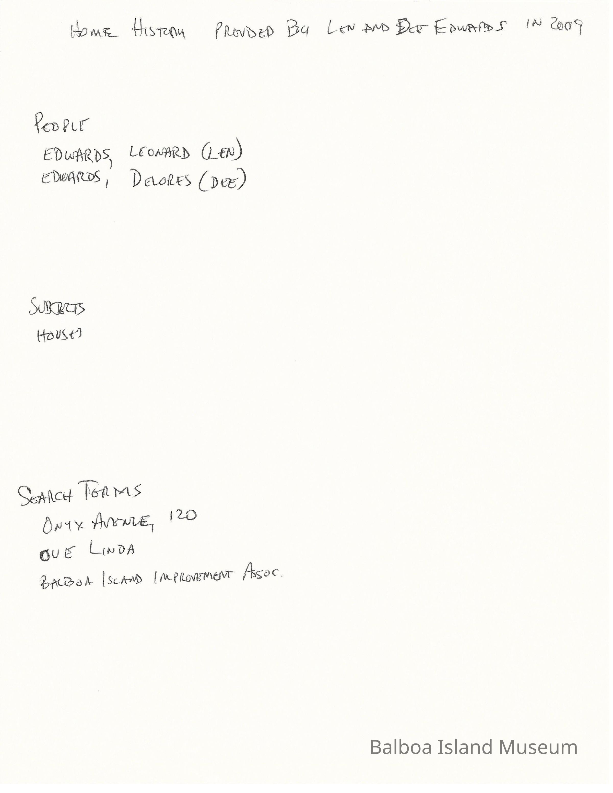 A history of 120 Onyx Avenue written and complied by Leonard Edwards. It's two pages and written on Yellow Notebook paper.Lexicon