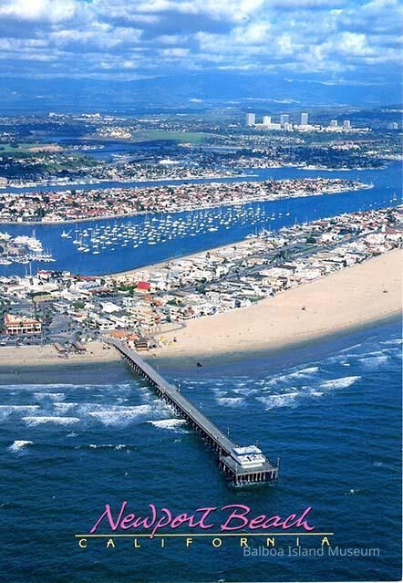A vertical print color aerial postcard taken from over the ocean looking down on the Newport Pier towards the harbor and inland area. Lido Isle is in the center with Fashion Island to the right and Upper Newport Bay to the left.
