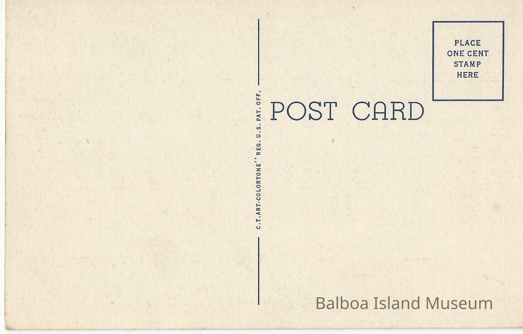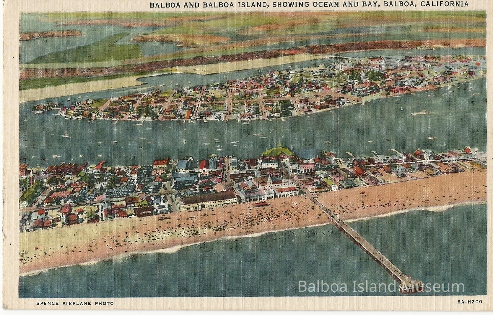 A color artistic image of the west side of balboa Island and part of the Balboa Peninsula near Balboa Pier. It's itendified a a Spence Airplane Photo. The style is a "C.T., Art-Colortone".Lexicon