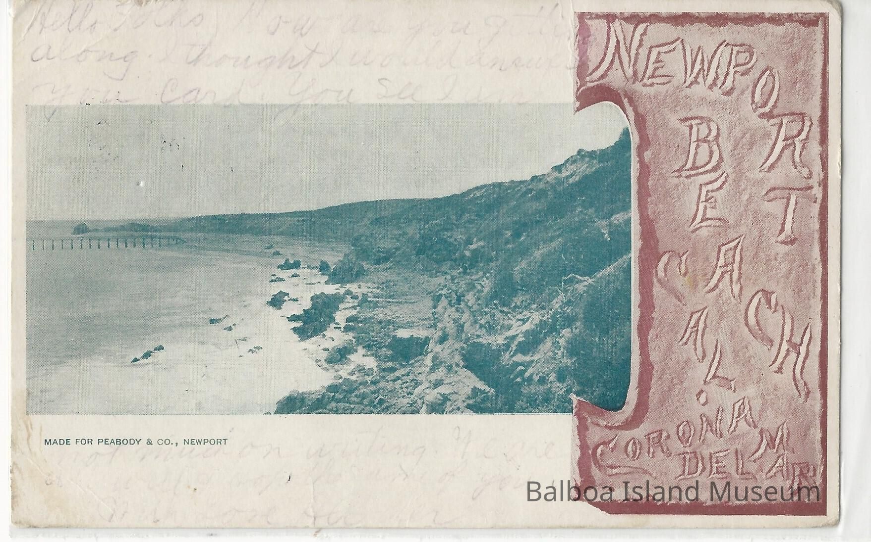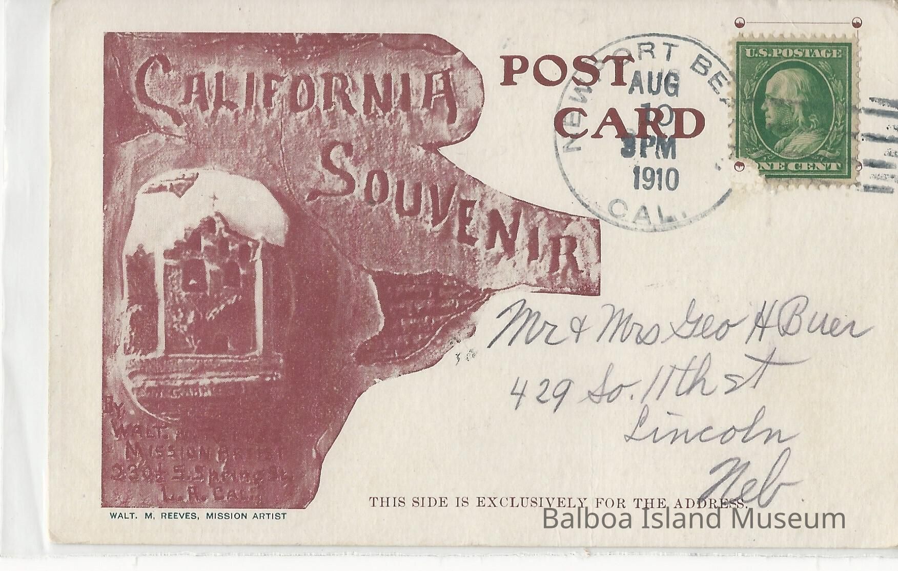 An old postcard sent in Aug of 1910. The image on the back is of Corona del Mar beach with only a old wooden pier on it. The other side reads "California Souvenir by Wallt. M. Reeves, Mission Artist.