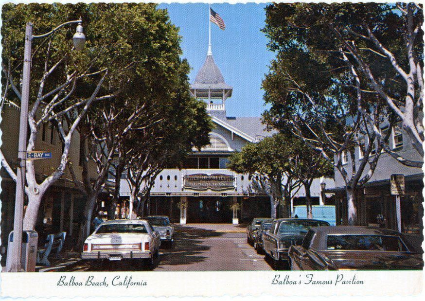 A color postcard of the Balboa Peninsula taken from the E. Bay/Main St. intersection. White banner on the bottom reads "Balboa Beach, California Balboa's Famous Pavilion".