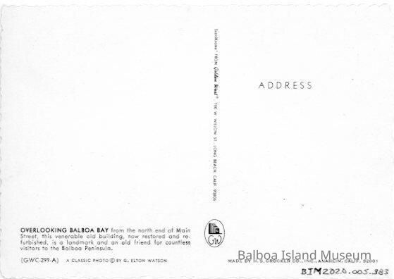 Unused. Published by Golden West in Long Beach. Photograph by George Elton Watson. Printed by H. S. Crocker Co., Inc. Postcard number GWC-299-A.Subject