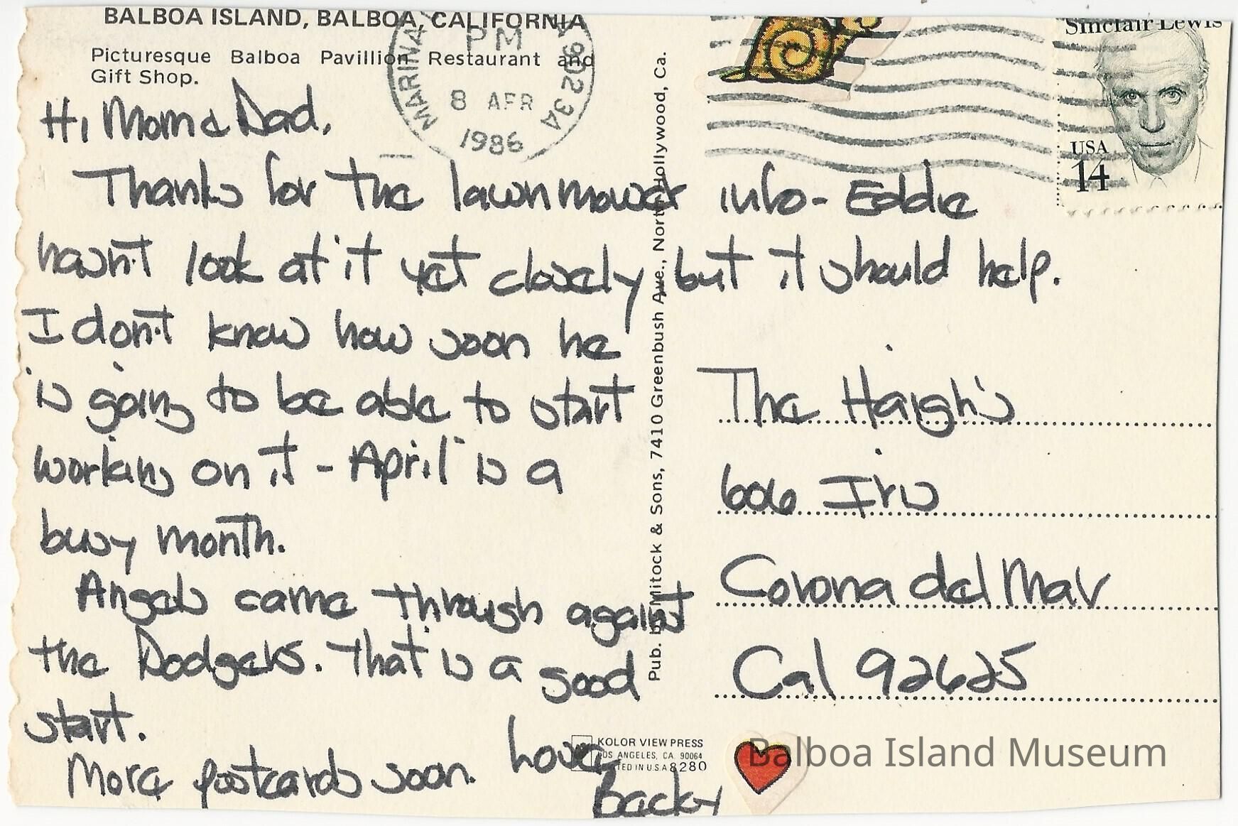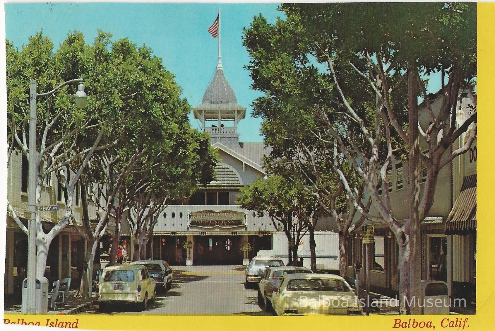 Postcard with a photograph of the Balboa Pavilion on it/ The back reads: Balboa Island, Balboa, california. Picturesque Balboa Pavillion Restaurant and Gift Shop.Lexicon