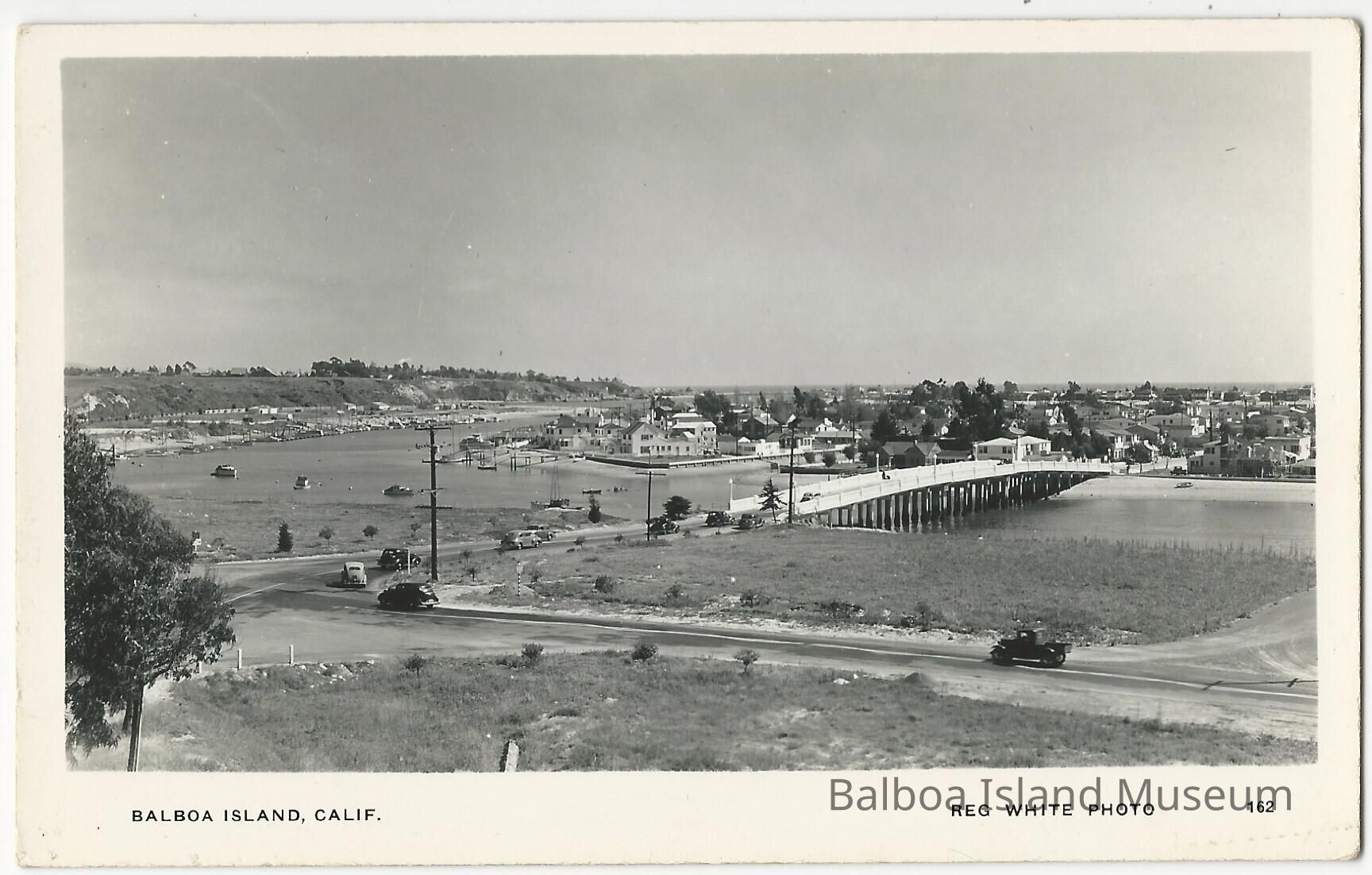 A black and white photograph of the bridge crossing onto Balboa Island from Bayside. The cars suggest the photograph was taken in the 1940s or 1950s.
