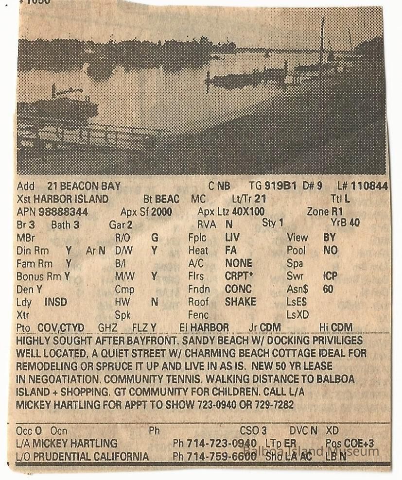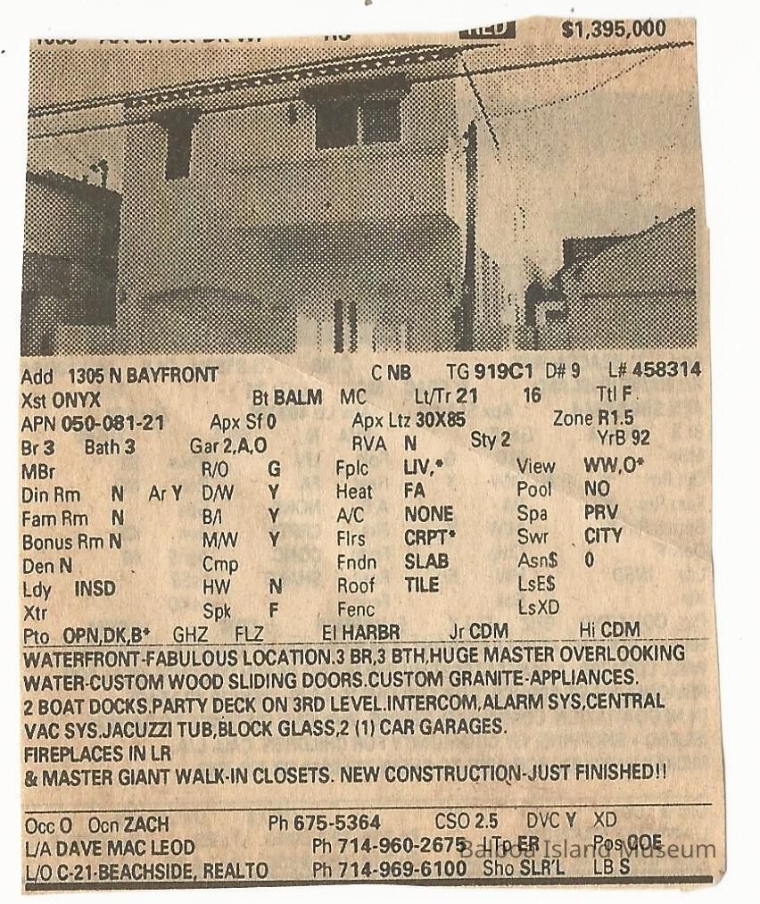 A small advertisement clipping with real estate listings from 1305 North Bay Front and 21 Beacon Bay.Lexicon