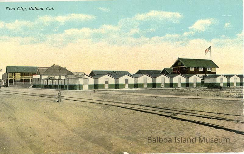 A colorized photograph of "Tent City, a hotel that consisted of pop-up tent like buildings which were a room a piece. There is sand instead of streets and wooden 'boardwalks' connect the tents. Near the Balboa Pavilion.