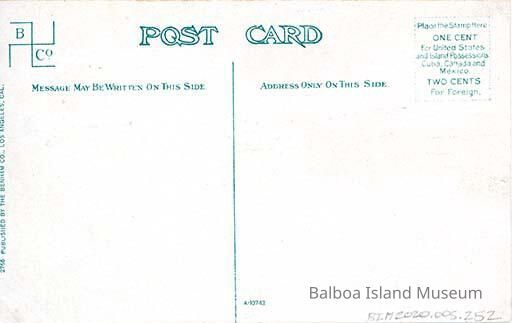 Unused. Published by the Benham Co. in Los Angeles. Postcard number 2766 and print number A-10742. Stamp box is dashed line with "Place the Stamp Here One Cent for United States and Island Possessions, Cuba, Canada, and Mexico Two Cents for Foreign" inside.Subject