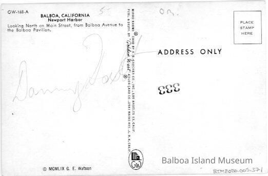 There is an arrow pointing to the Balboa Pavilion on the front of the postcard, indicating it is the building referred to as the one "to be torn down".Transcription
