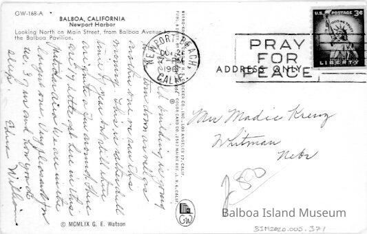 One used and one sent. Sent postcard mailed from Newport Beach on October 21, 1961 to Whitman, Nebraska. Sent to Madie Krenz by Edna Williams.