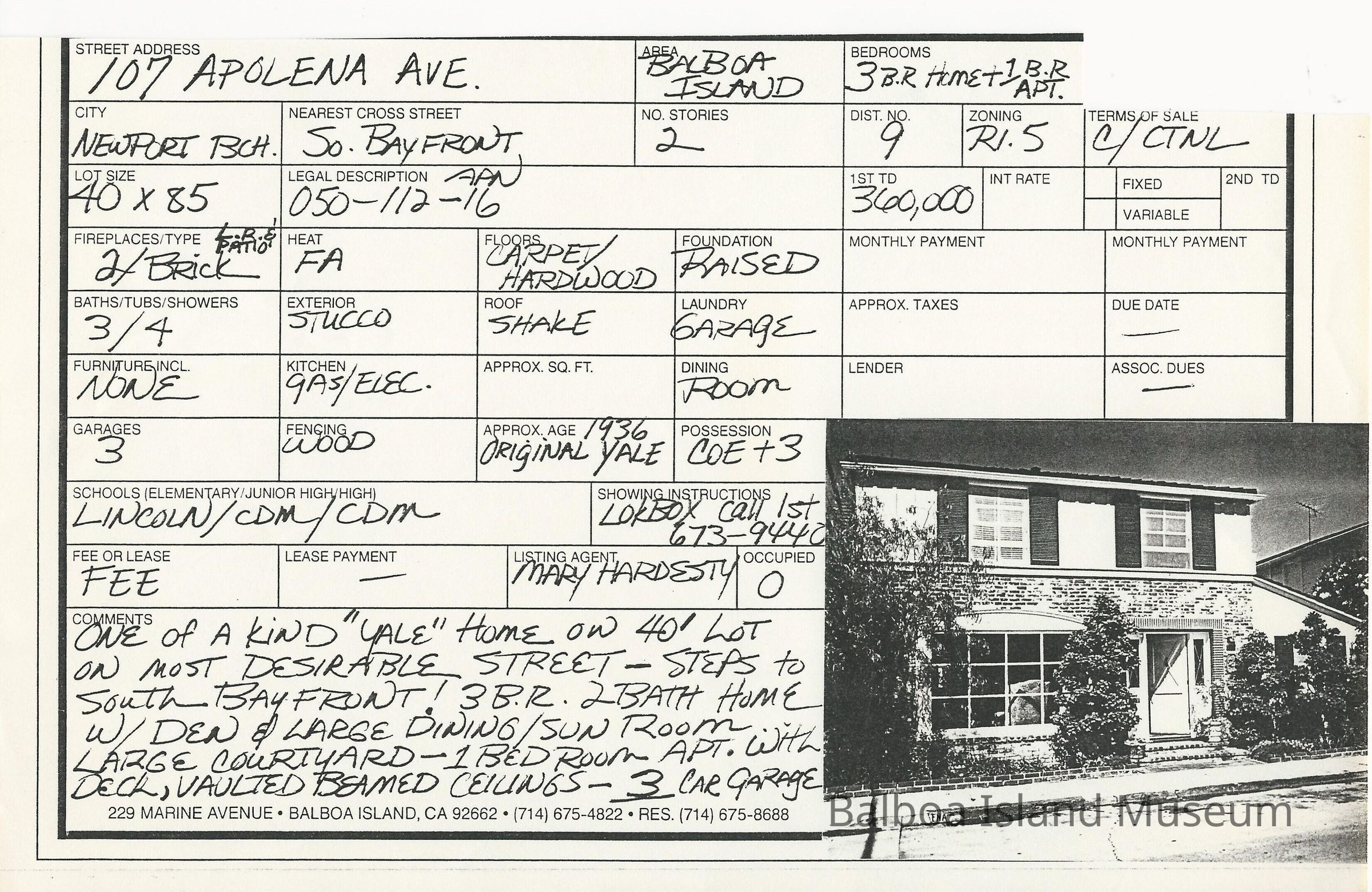 A real estate advertisement for 107 Apolean Avenue. The house is still there as of November 2017.Lexicon