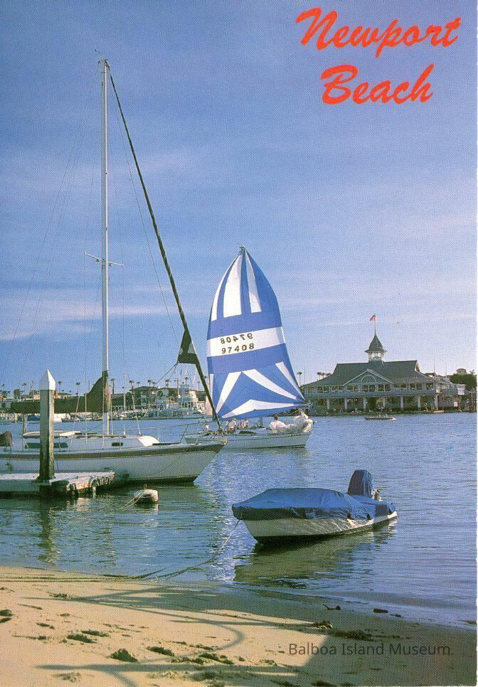 A color postcard of the Balboa Pavilion with a blue and white stripped sailboat in front. The registry number on the boat is 97408. Taken from the shore on Balboa Island in the 500 blocks of South Bay Front. Vertical postcard.