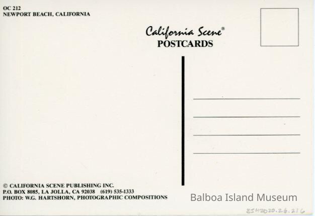 Published by California Scene Publishing Inc. Photograph by W. G. Hartshorn. Postcard number OC 212.Subject