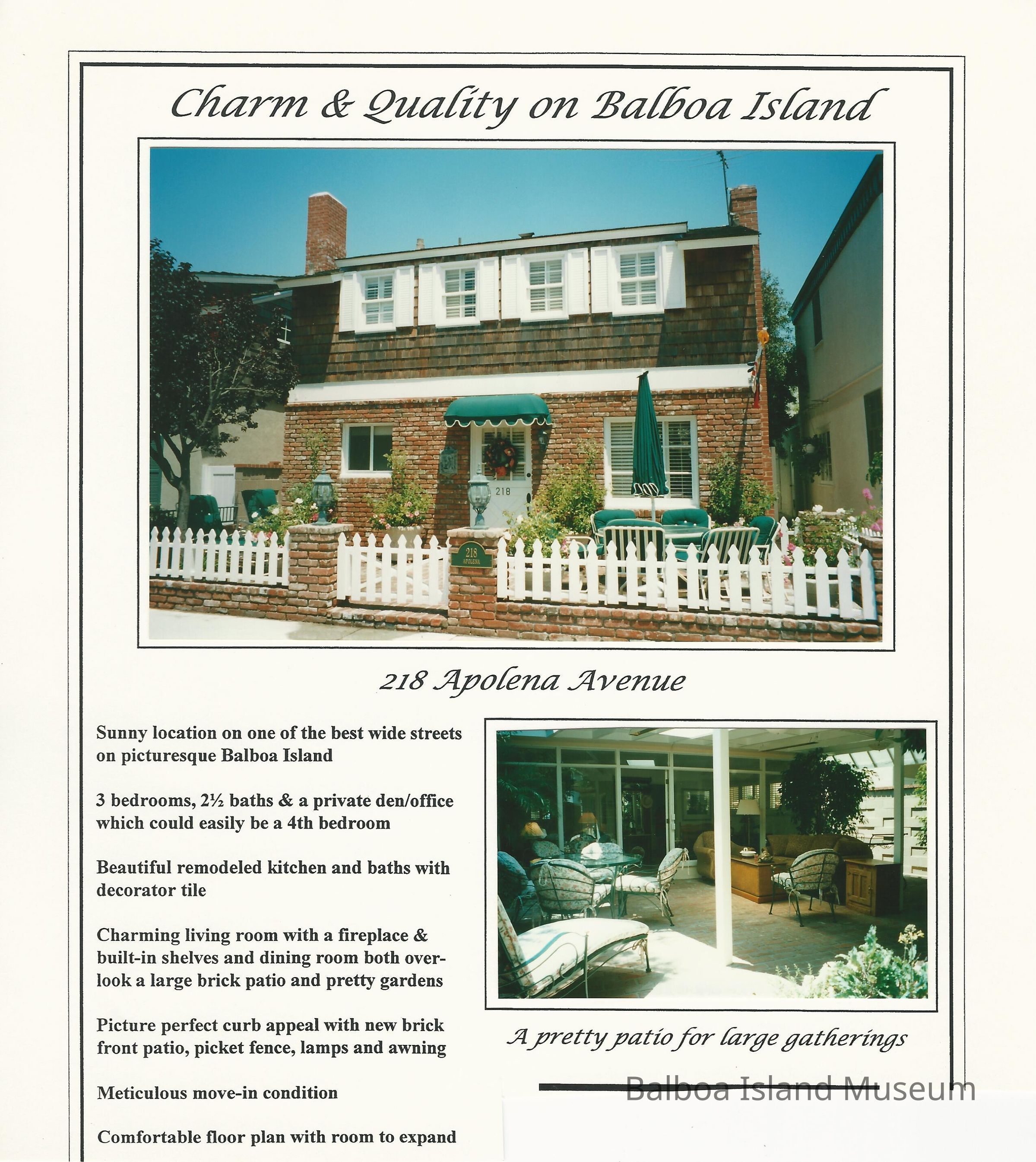 A real estate flyer for 218 Apolean Avenue. Likely the original due to the fact the photographs are glued on. The house is still there but has been remodeled slightly.Lexicon