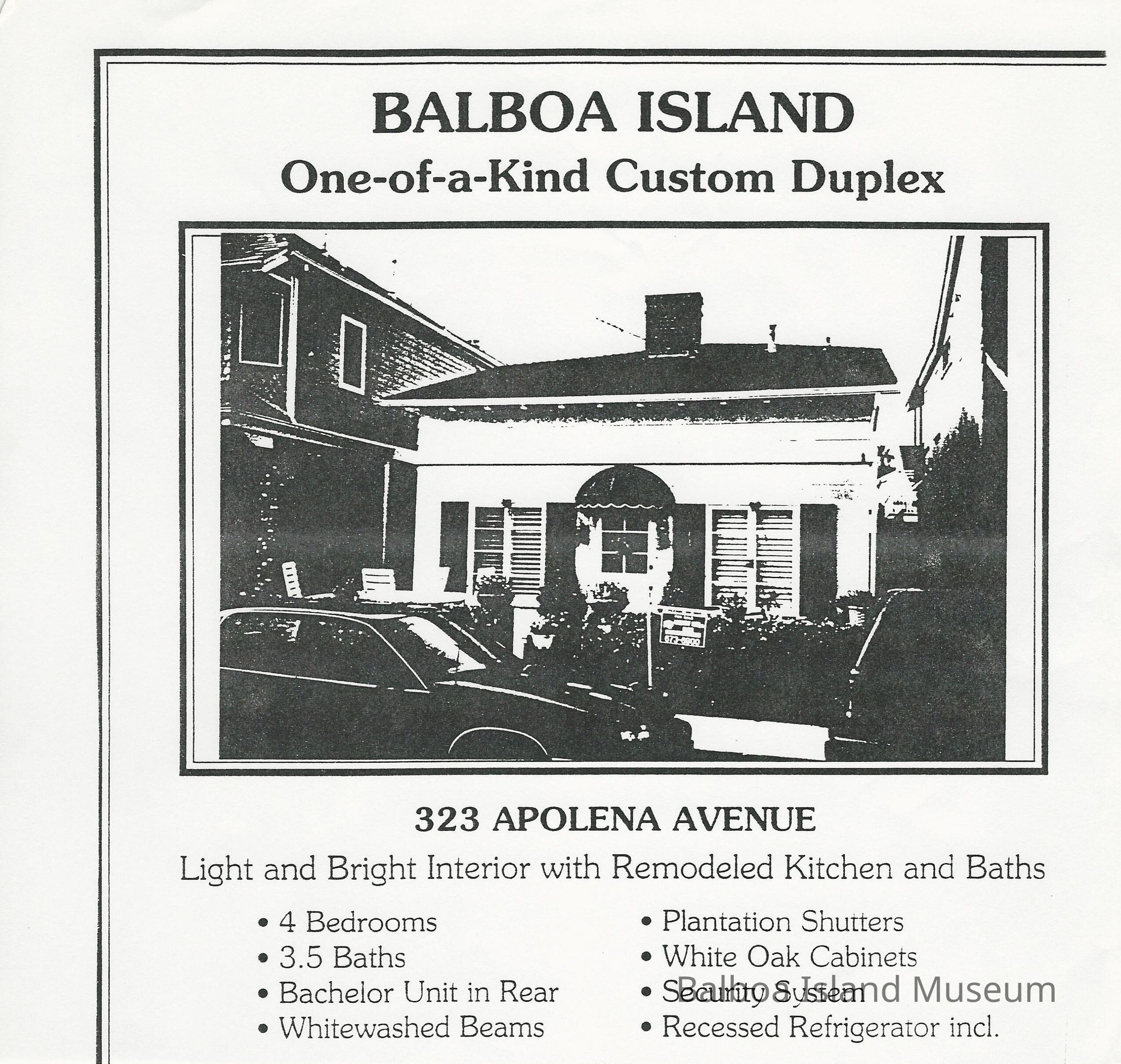 A black and white photocopy of a real estate flyer for 323 Apolena Avenue. The flyer touts a remodeled kitchen and baths. It was originally in color.Collection