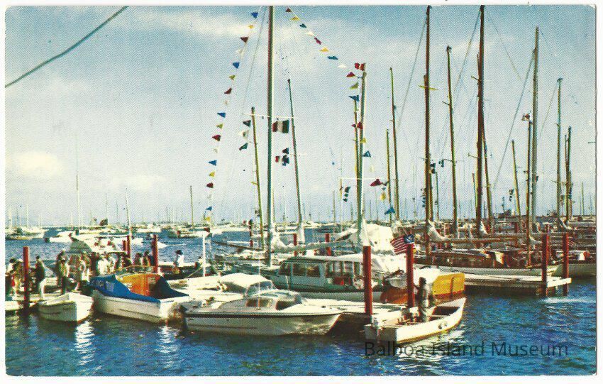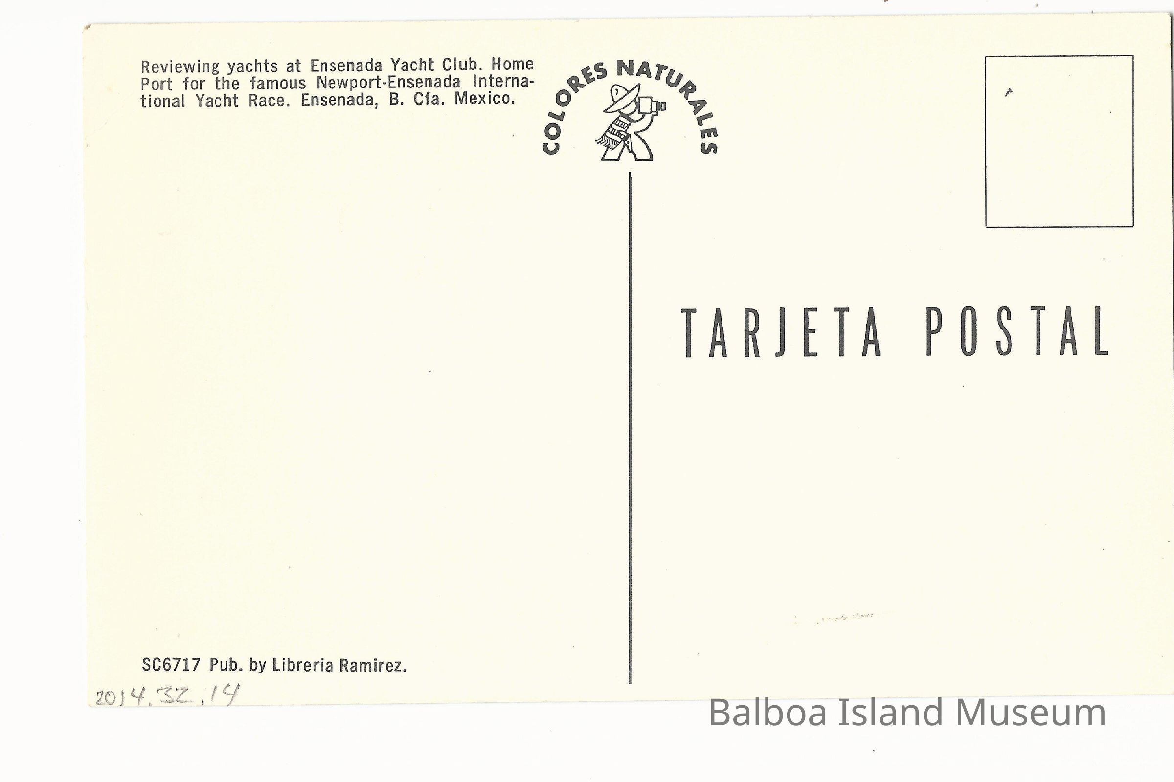 A postcard with a series of boats on one side. The other identifies it as being taken at the Ensanada Yach Club in Baja California, Mexico. The club is the home port for the famous Newort-Ensenada international yacht race.