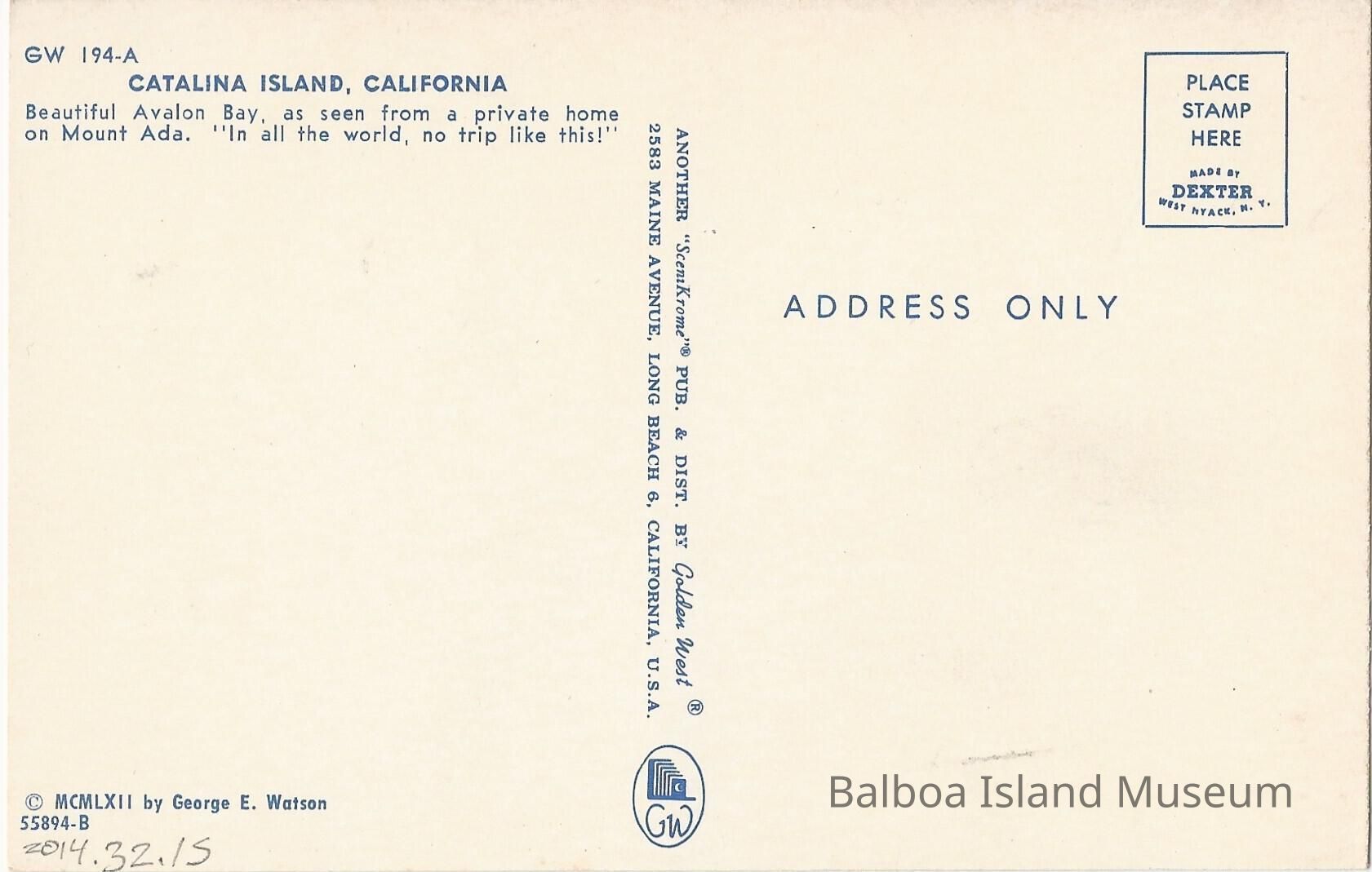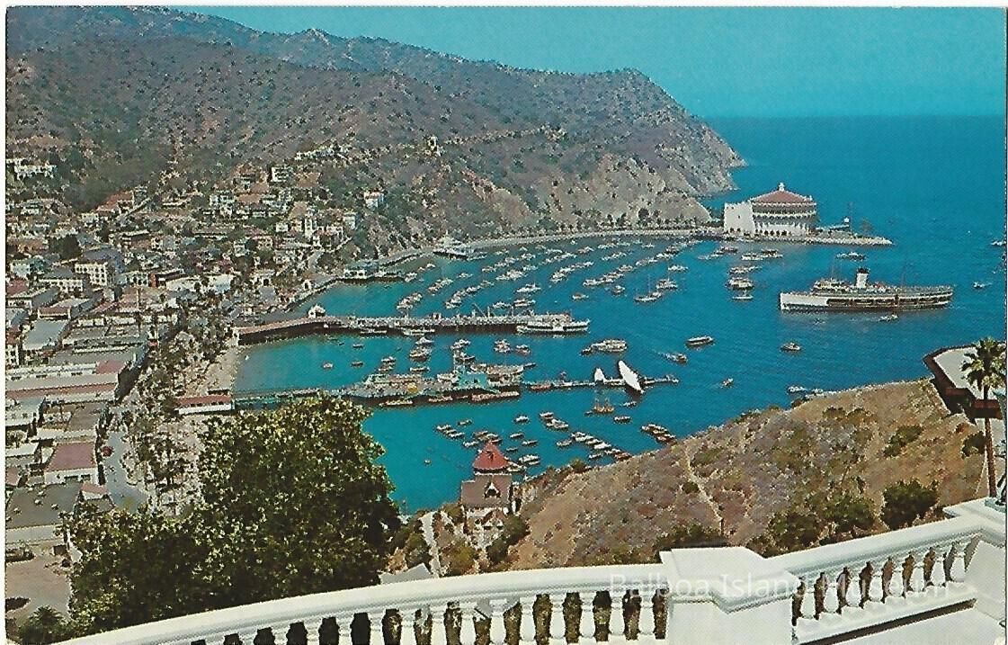 A postcard with a photograph of the Avalon harbor and the casino on Catalina taken from the balcony of a private home on Mount Ada. Photograph copyright 1962 by Geroge E. Watson.