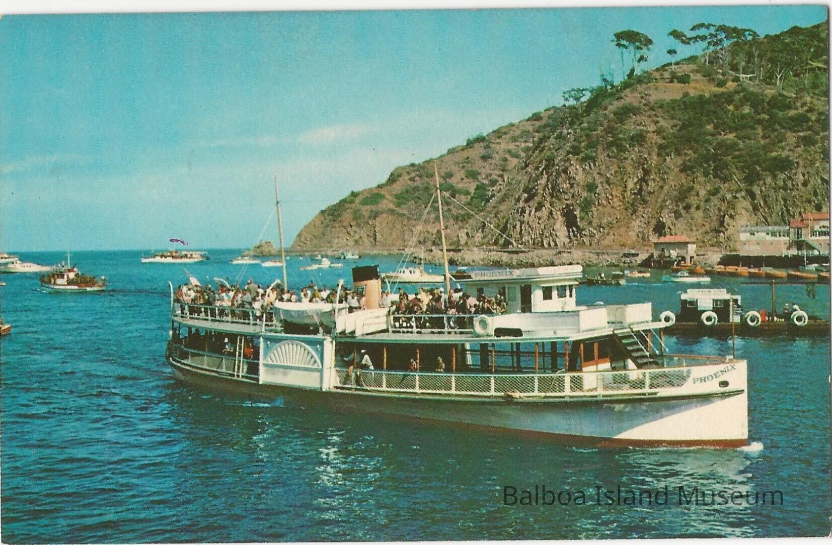 A color photograph of a large boat near the Avalon harbor named Phoenix. The back identifies it as "The Famoun glass bottom boat trip over world renowned Under-Sea Gardents". Put out by Western Publishing & Novelty Co, Los Angeles, Calif.Lexicon