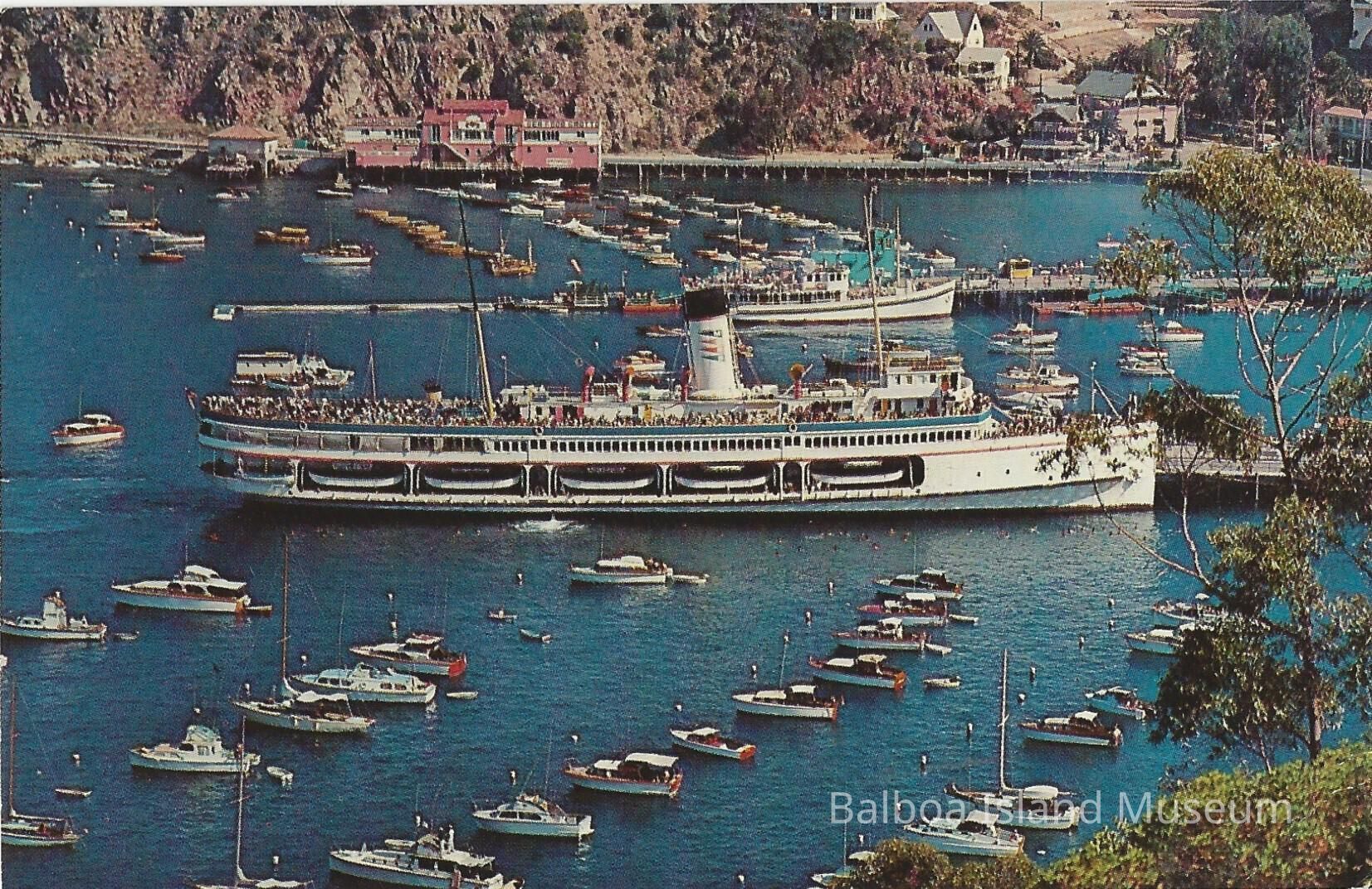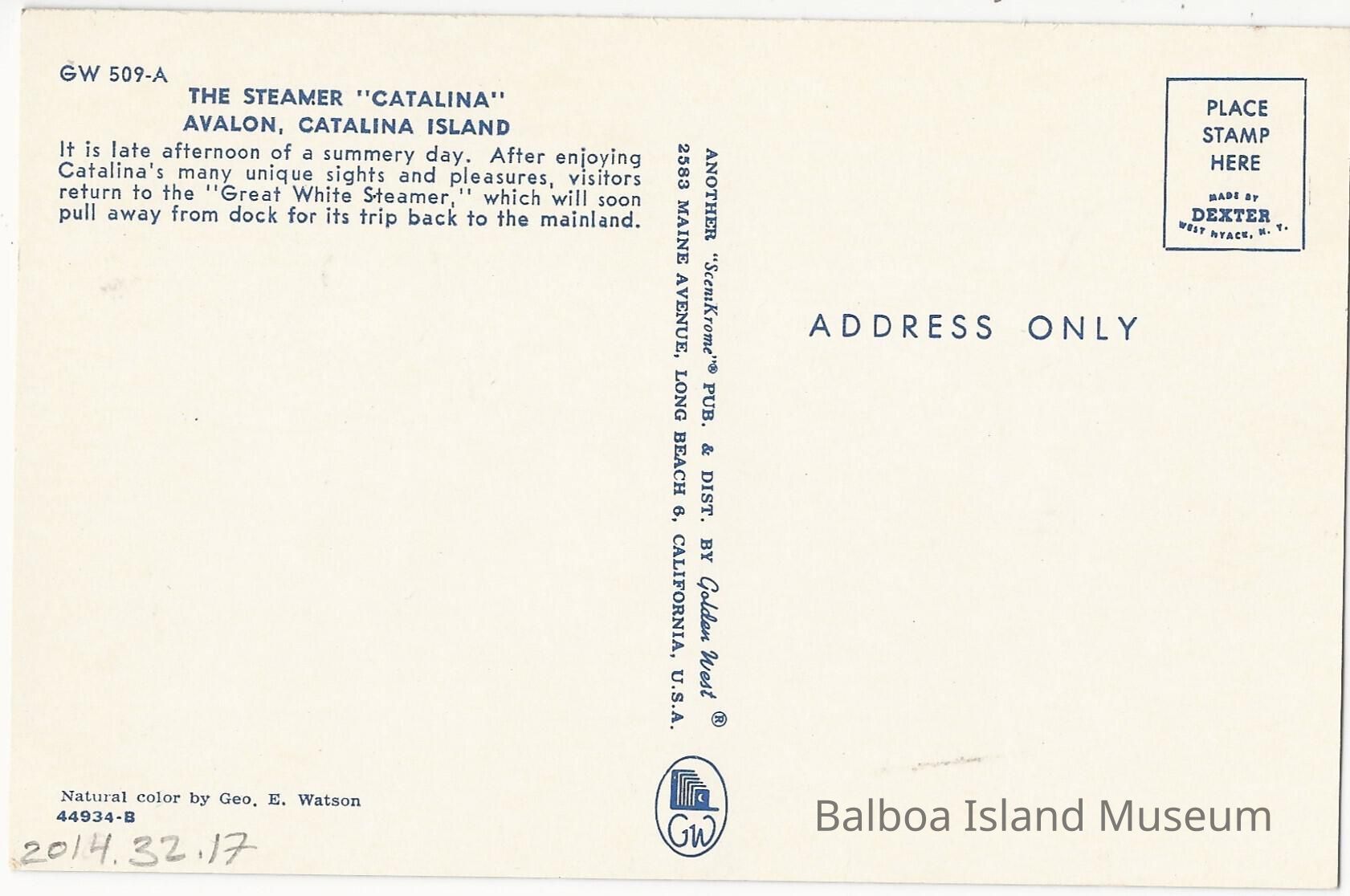 A postcard with a photograph of a large steamer ferry named "Catalina" docked in Avalon harbor. Photograph by George E. Watson.