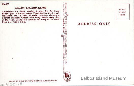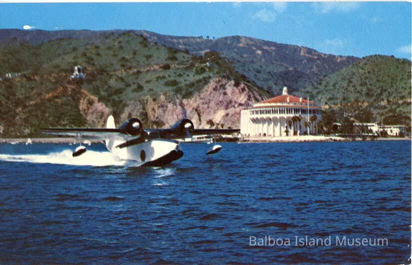 A postcard with a photograph of a pontoon plane taking off from the Avalon harbor. The text identifies is as an "Amphibian air yacht" leaving for Long Beach. The plane was operated by Avalon Air Transport which flew between Long Beach and Avalon, 17 minutes away from each other.
