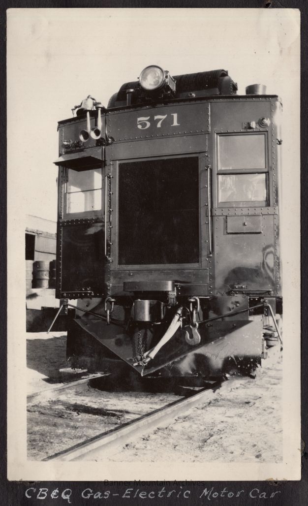 Chicago, Burlington and Qunicy gas-electric doodlebug motor car #571, Casper, circa 1926.Photograph Details