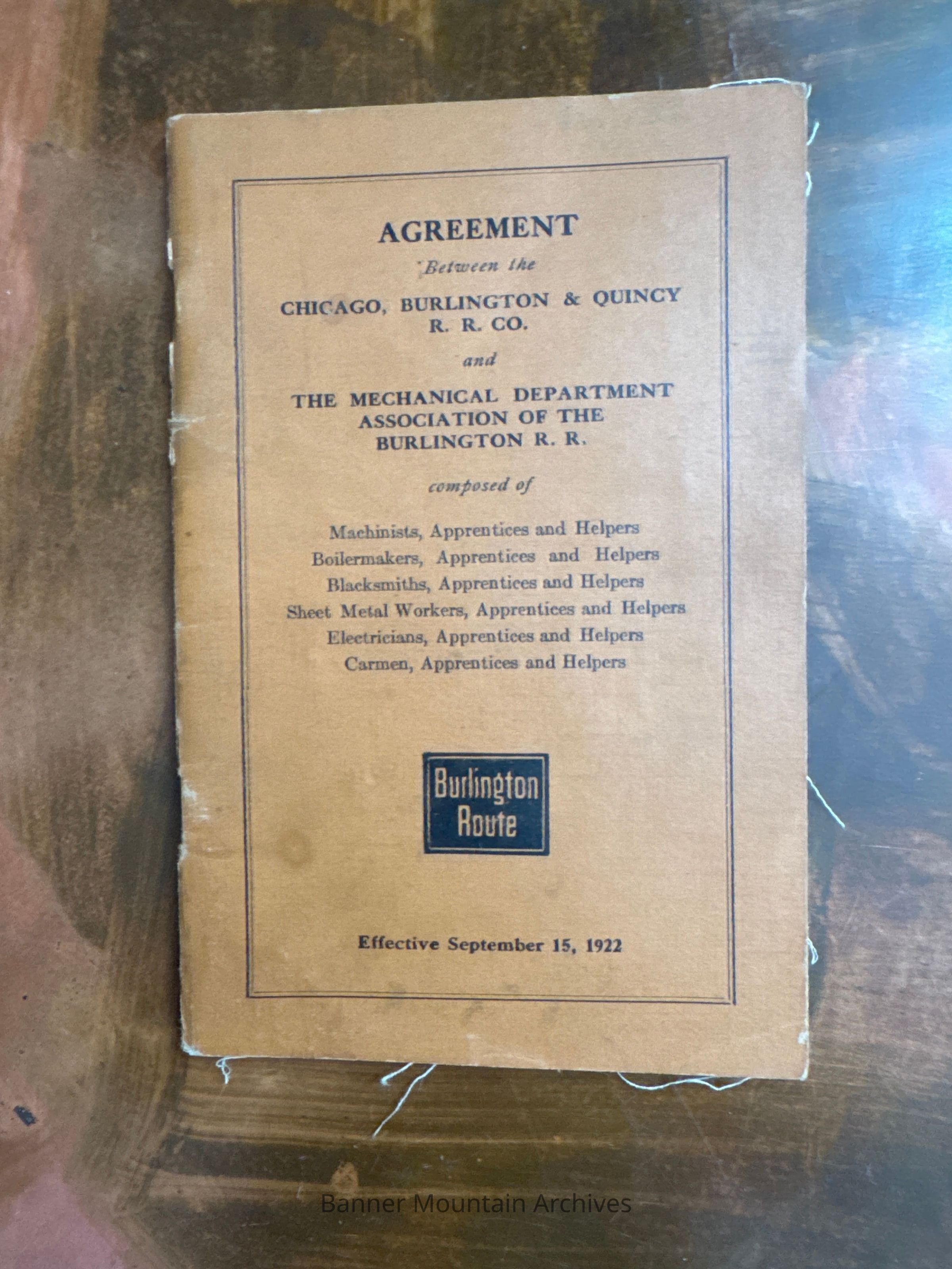 Agreement between the CB&Q and the Mechanical Department Association of the Burlington Railroad, September 15, 1922.Creator