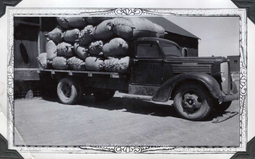 Banner Ranch truck loaded with wool sacks at the wool warehouse in Casper, circa 1930s.Photograph Details
