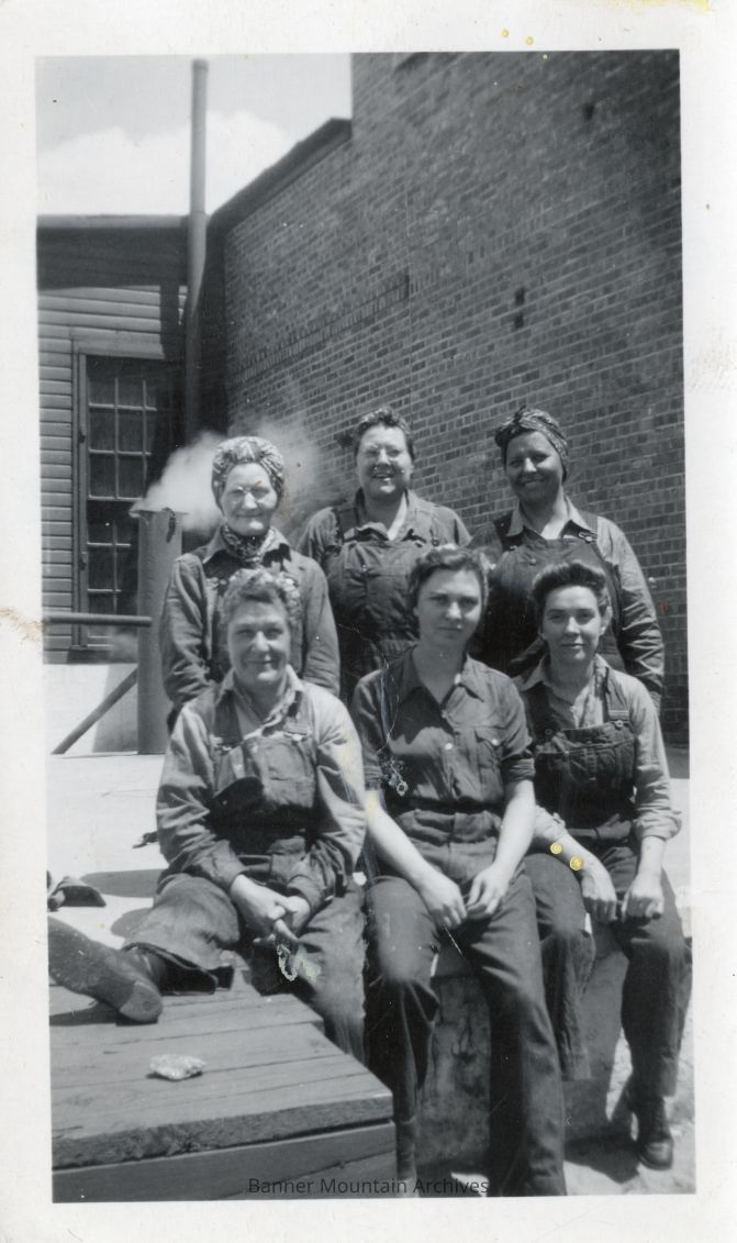 Women workers in the Chicago, Burlington and Quincy roundhouse in Casper during World War 2, May 1944. Top row, left to right, Christina Huber, Laura Ogilbee and Doris Gehrett. Bottom row, left to right, Rosie Smith, Juanetta Cunningham and Elaine Buchanan.Photograph Details