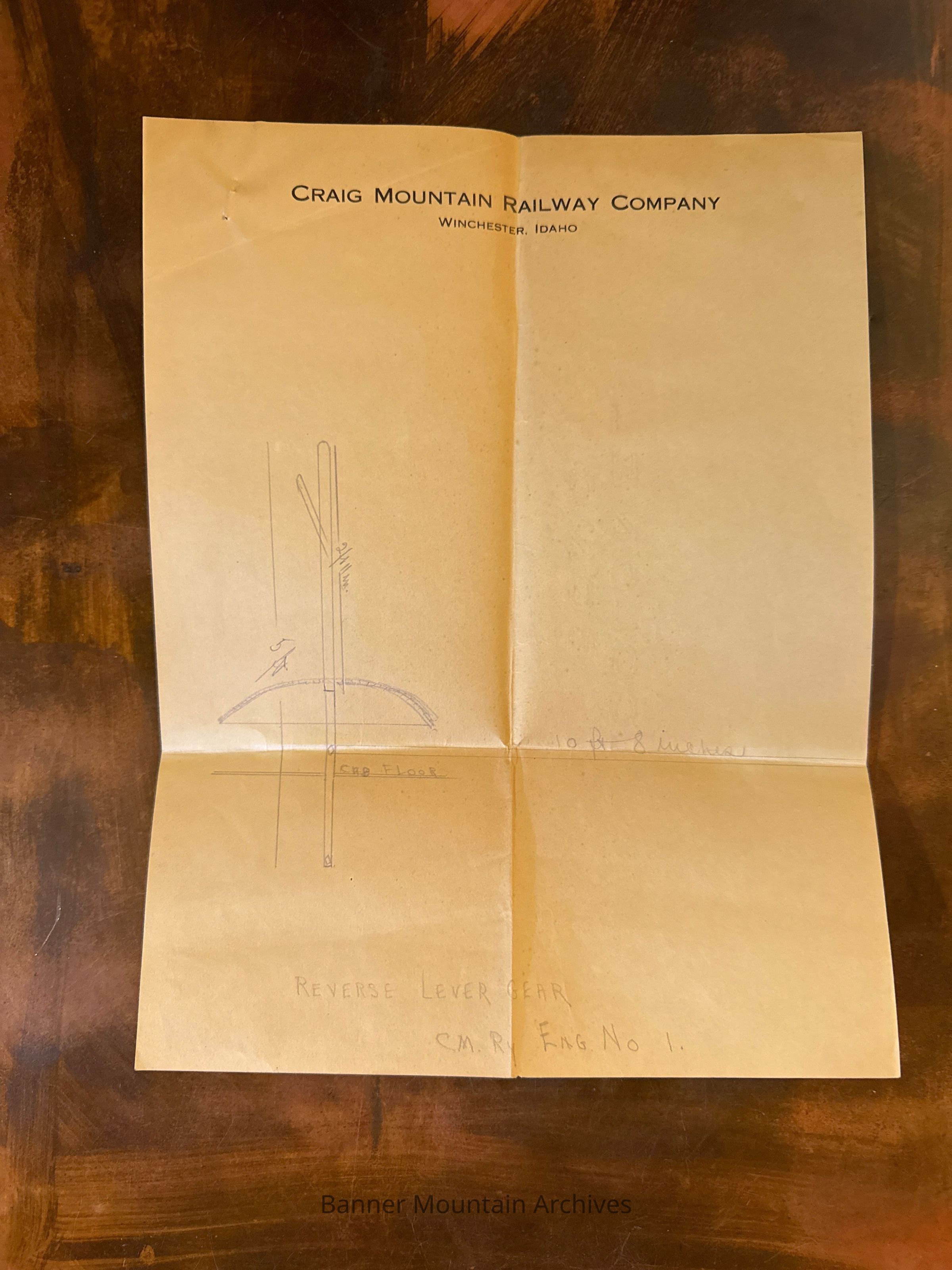 Sketch of the reverse lever gear on Craig Mountain Railway locomotive #1, circa 1931.
