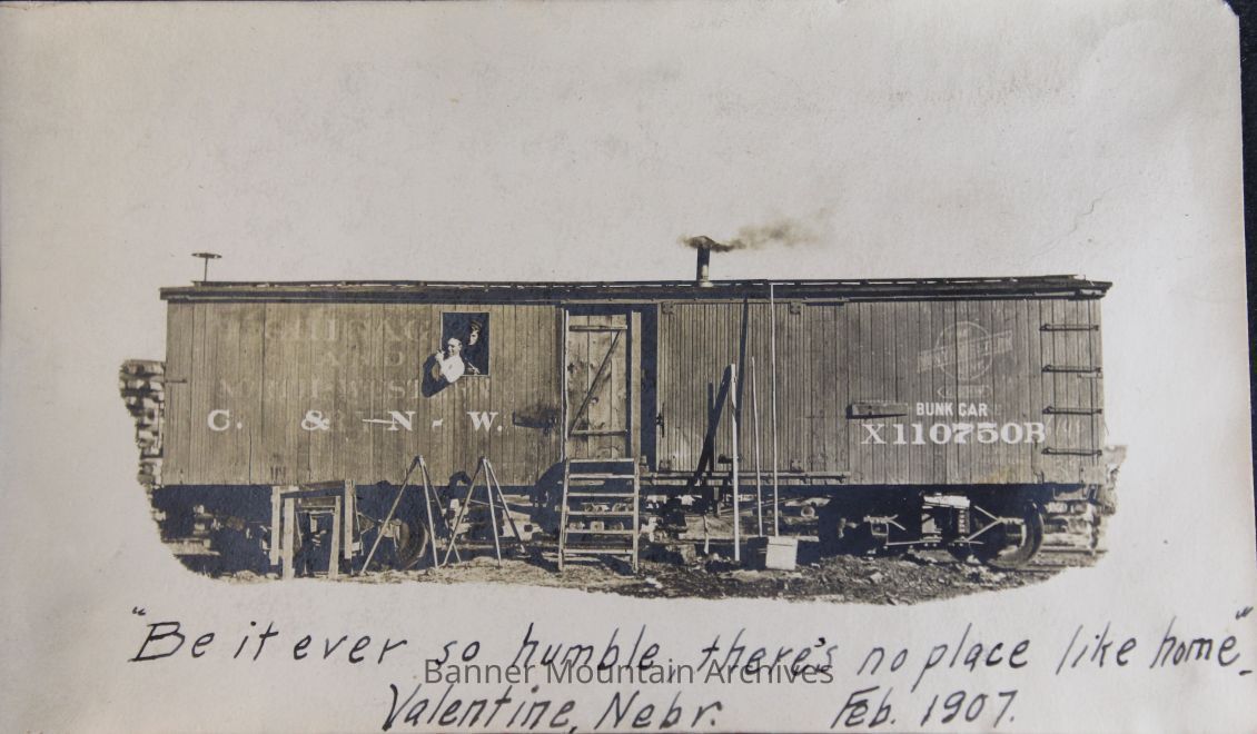 Chicago and North Western bunk car #X110750B used by a surveying crew, Valentine, Nebraska, February 1907.Photograph Details