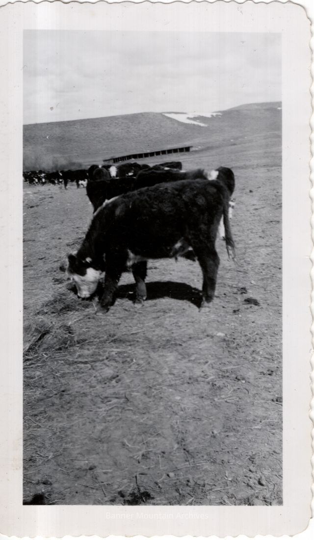 Hereford cows on feedline, cow shed in background, circa 1950s.Photograph Details